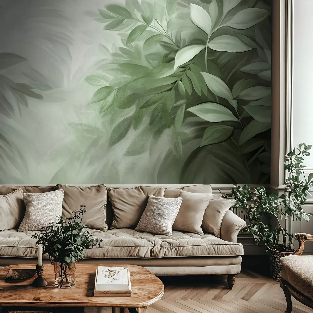 Тапете за зид Зелено и сиво лишће са меким, замућеним текстурираним лишћем, у сликарском стилу са видљивим потезима четкице бр. w09584v1