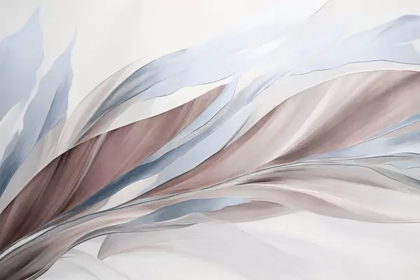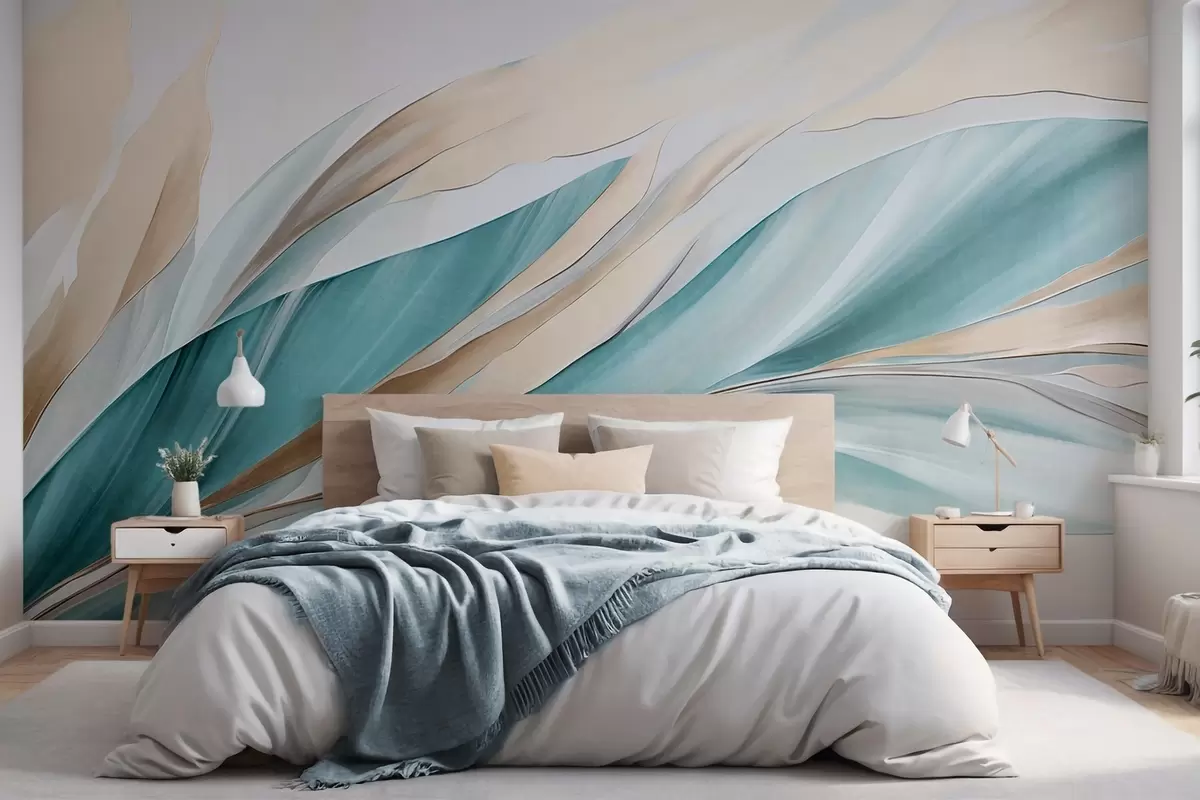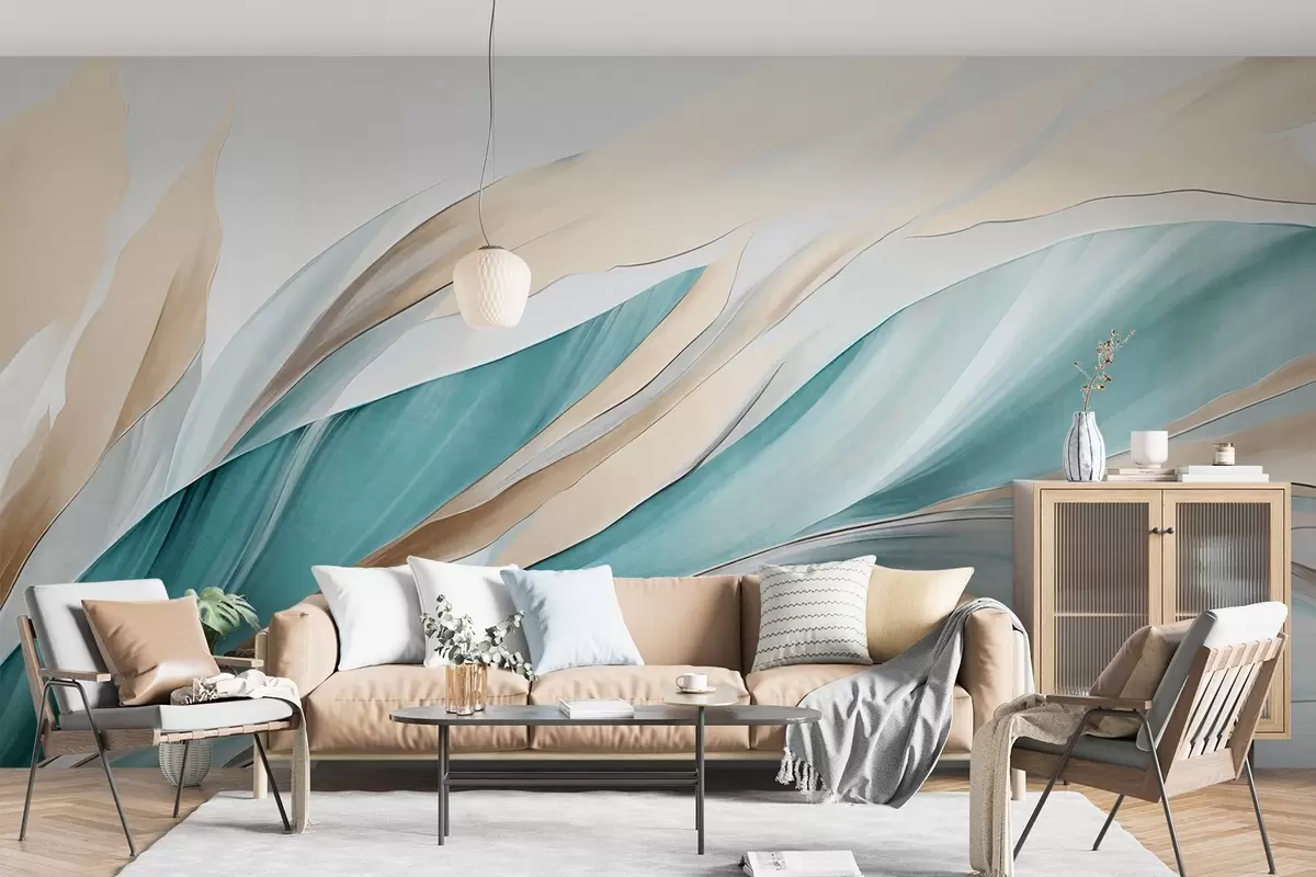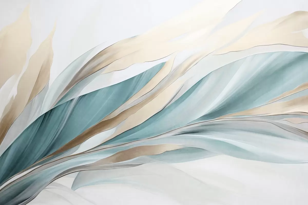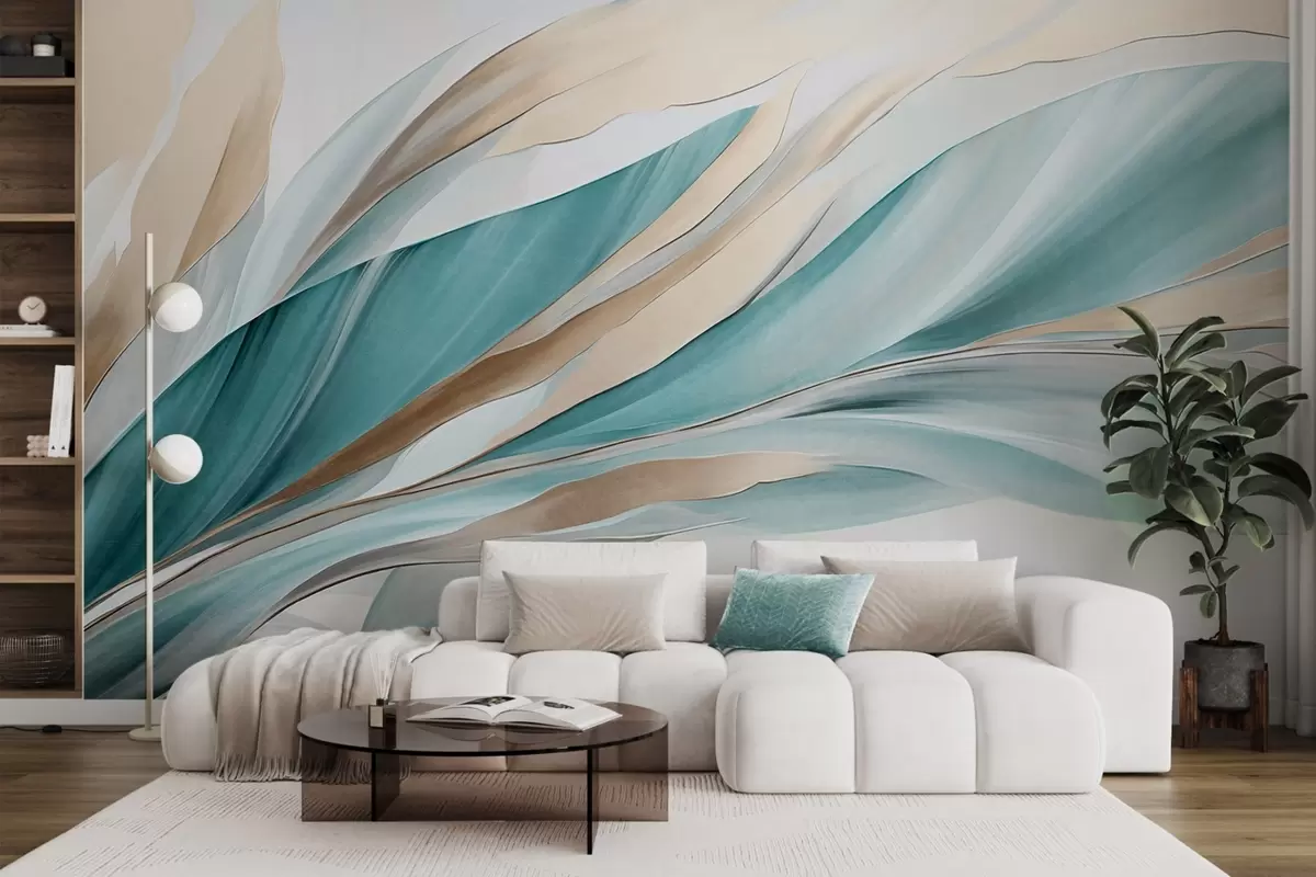 Тапете за зид Апстрактни текући таласи тиркизне и жуте боје, са танким облицима и линијама, на белој позадини, текстурирана уметност бр. w09585