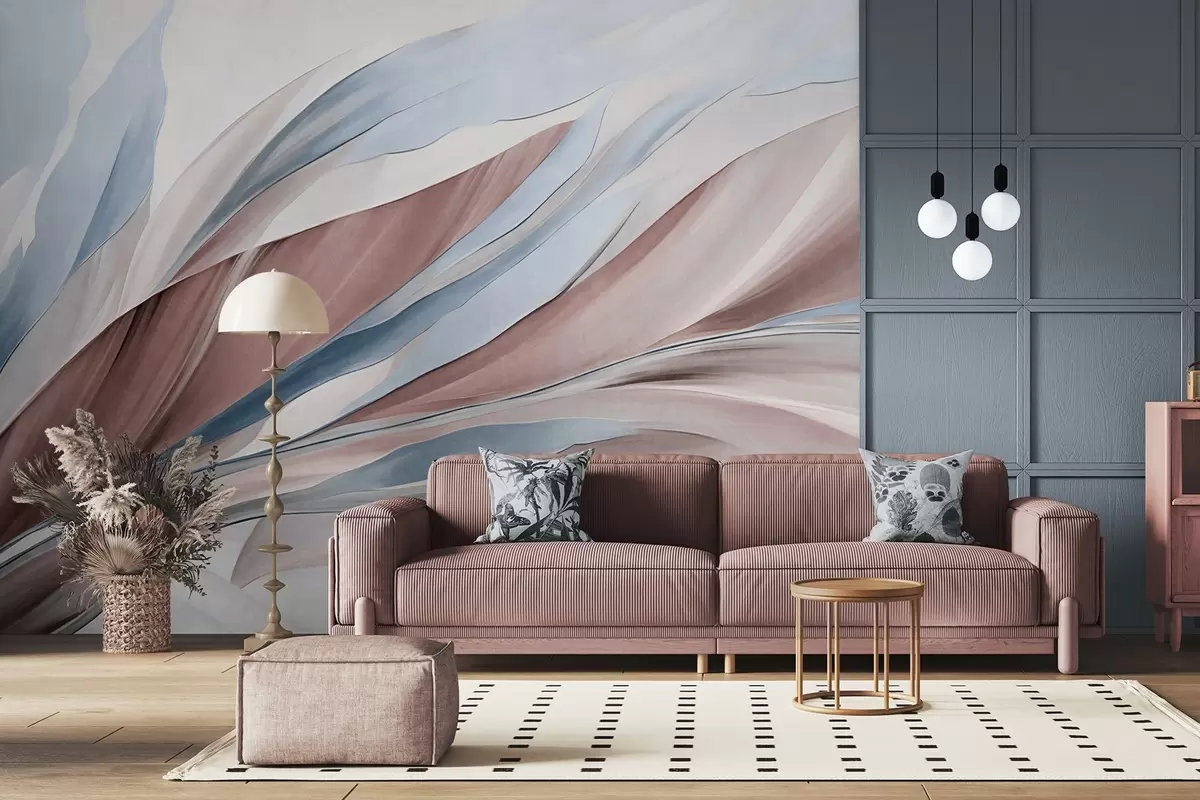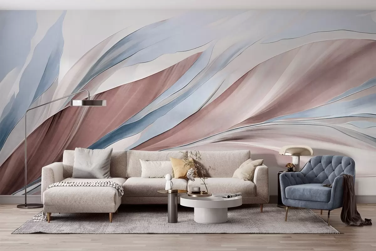 Тапете за зид Апстрактни текући таласи плаве и браон боје, са танким облицима и линијама, на белој позадини, текстурирана уметност бр. w09585v1