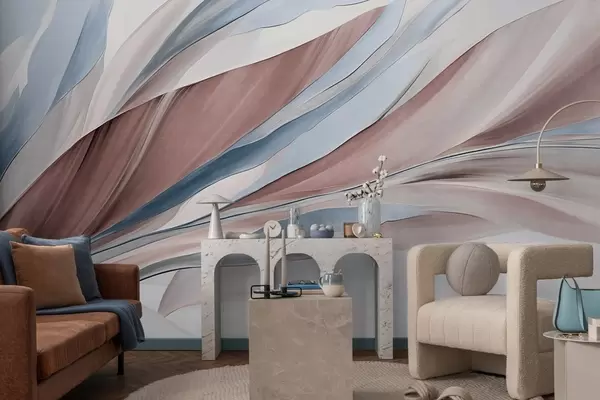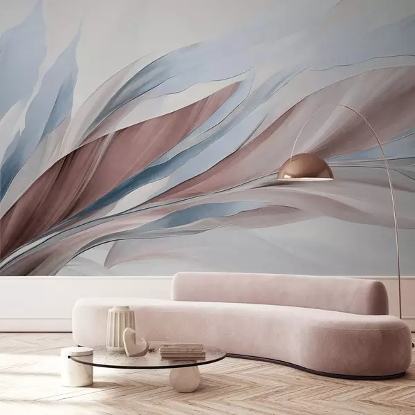 Тапете за зид Апстрактни текући таласи плаве и браон боје, са танким облицима и линијама, на белој позадини, текстурирана уметност бр. w09585v1