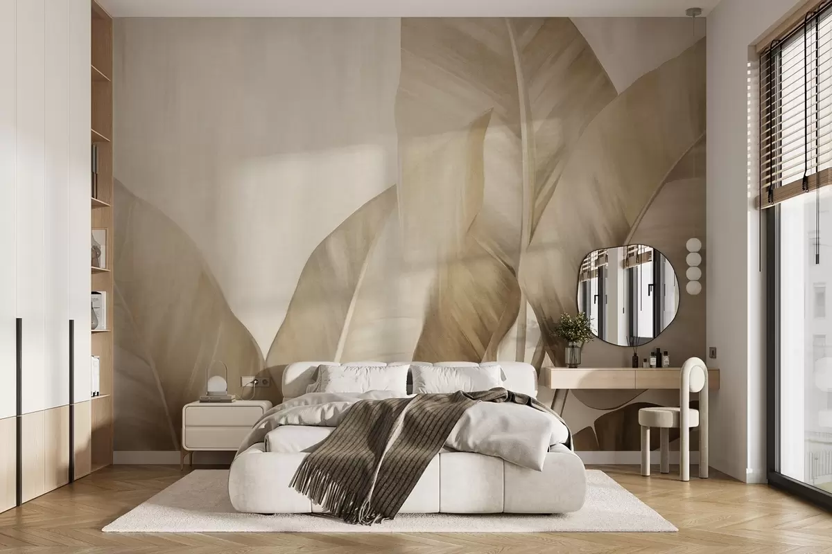 Тапете за зид Текстурирани велики, светло смеђи листови банане на светло беж позадини, са меком и минималистичком естетиком бр. w09586
