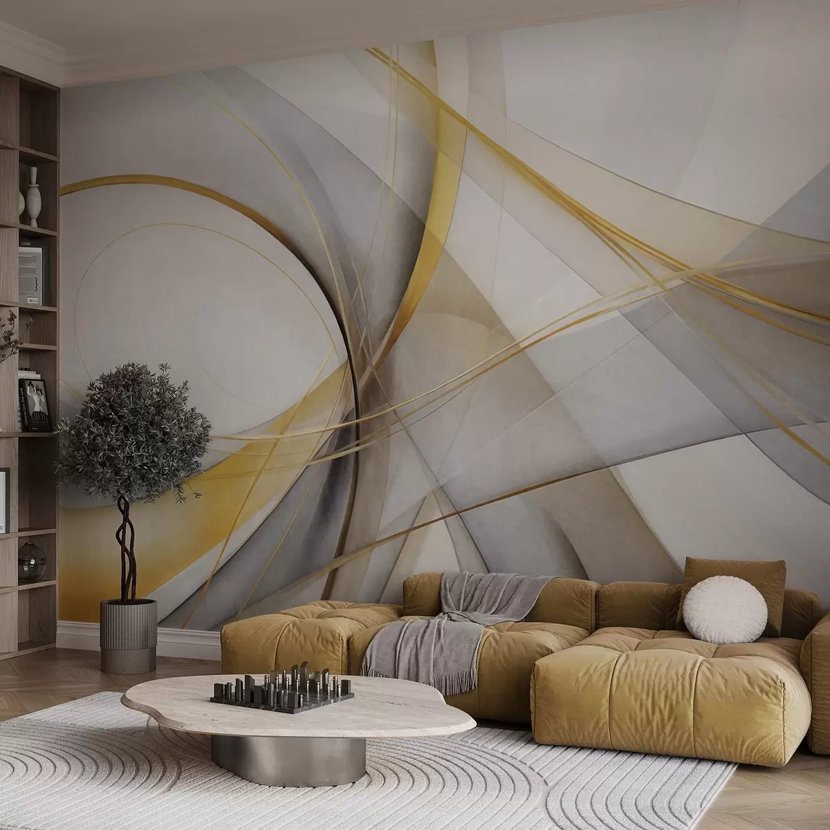 Тапете за зид Апстрактне текуће линије у жутој и белој боји на сивој позадини, са осећајем покрета и дубине, модерна уметност бр. w09587