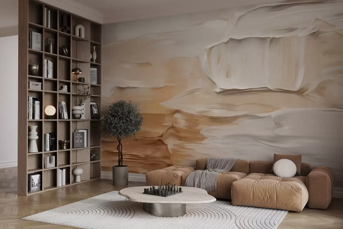 Тапете за зид Апстрактна текстурирана имитација потеза четкицом у топлим земљаним тоновима беж, крем и браон, модерна уметност бр. w09588