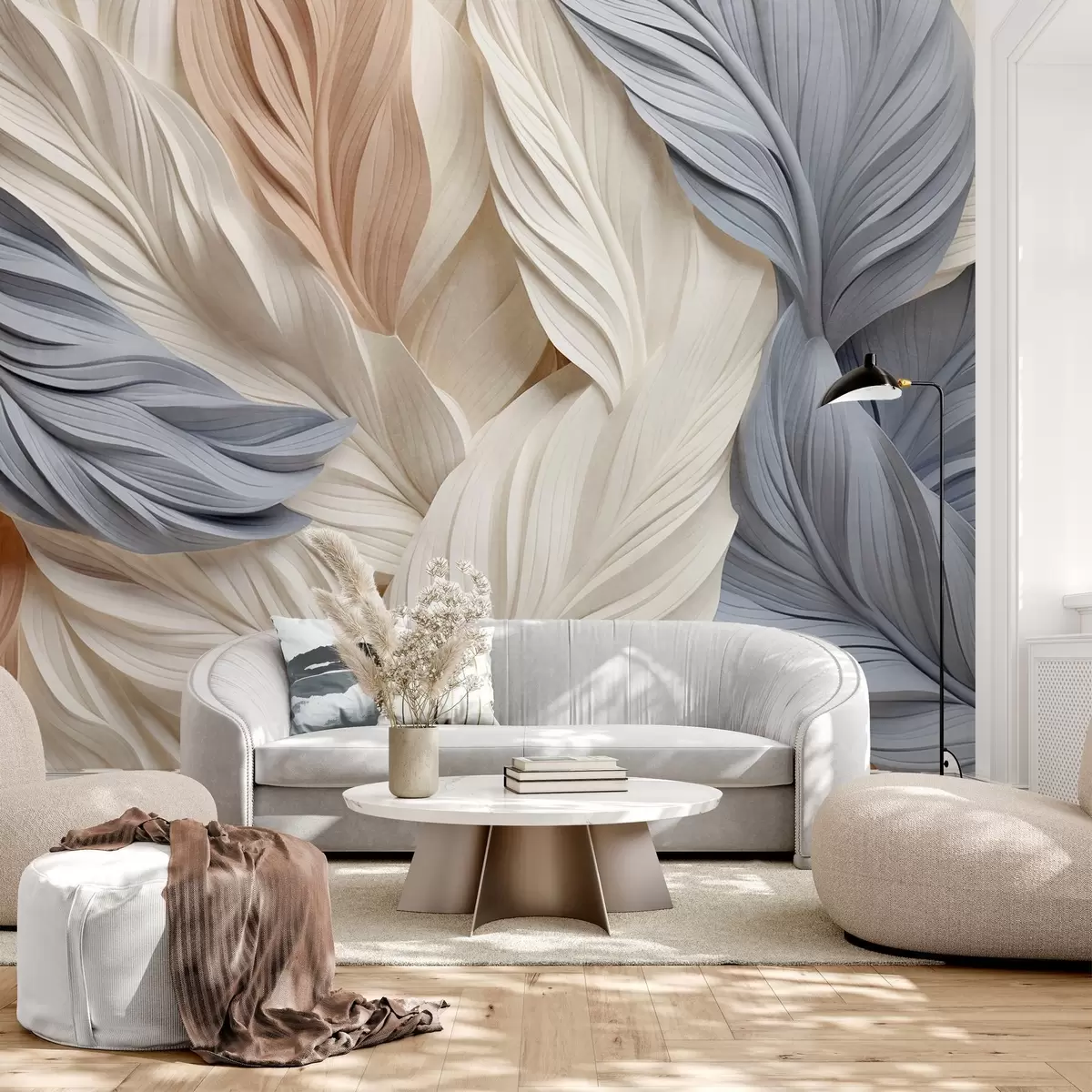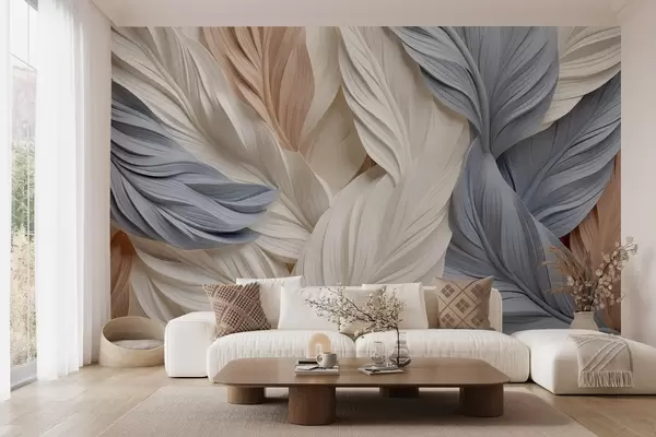 Тапете за зид Апстрактно, слојевито перје у кремастим, беж и светлоплавим нијансама, са текстурираним, органским изгледом бр. w09603