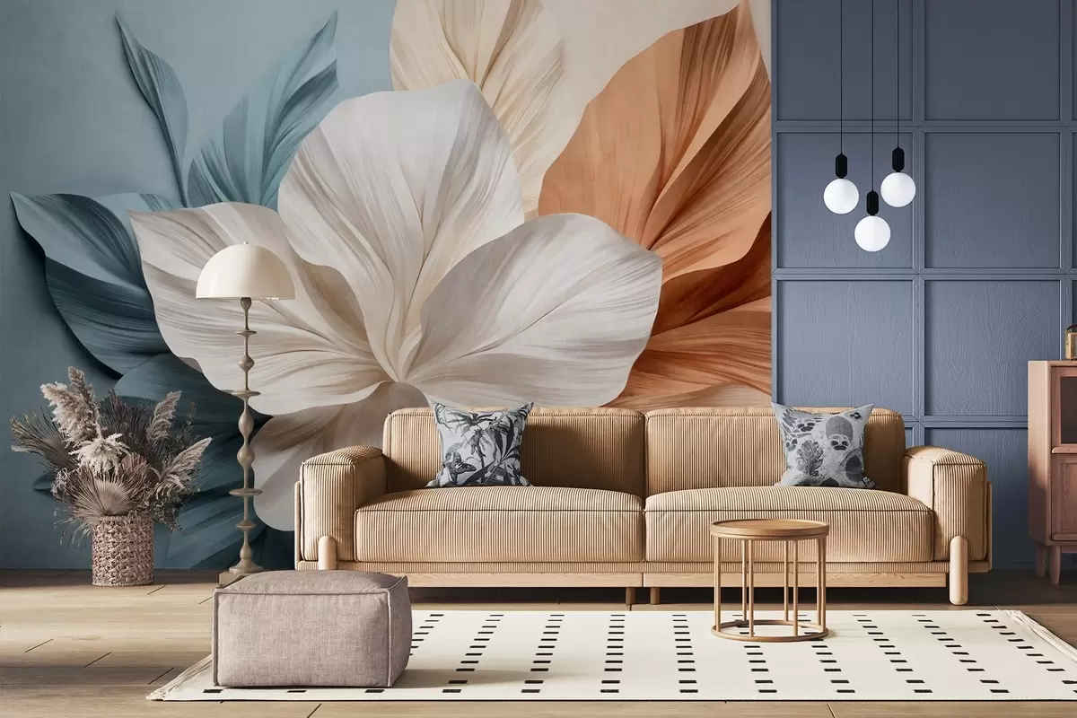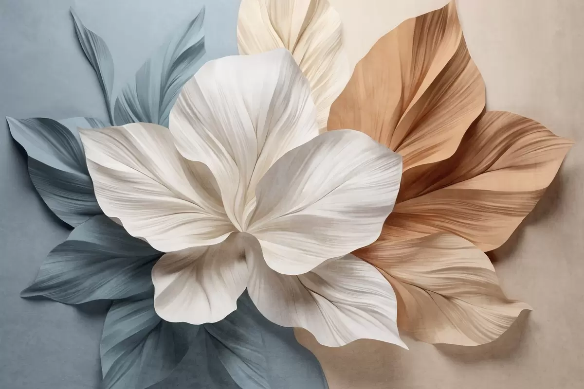 Тапете за зид Апстрактни цвет са више латица и текстурираним листовима у нијансама брескве и плаве, мека позадина бр. w09604