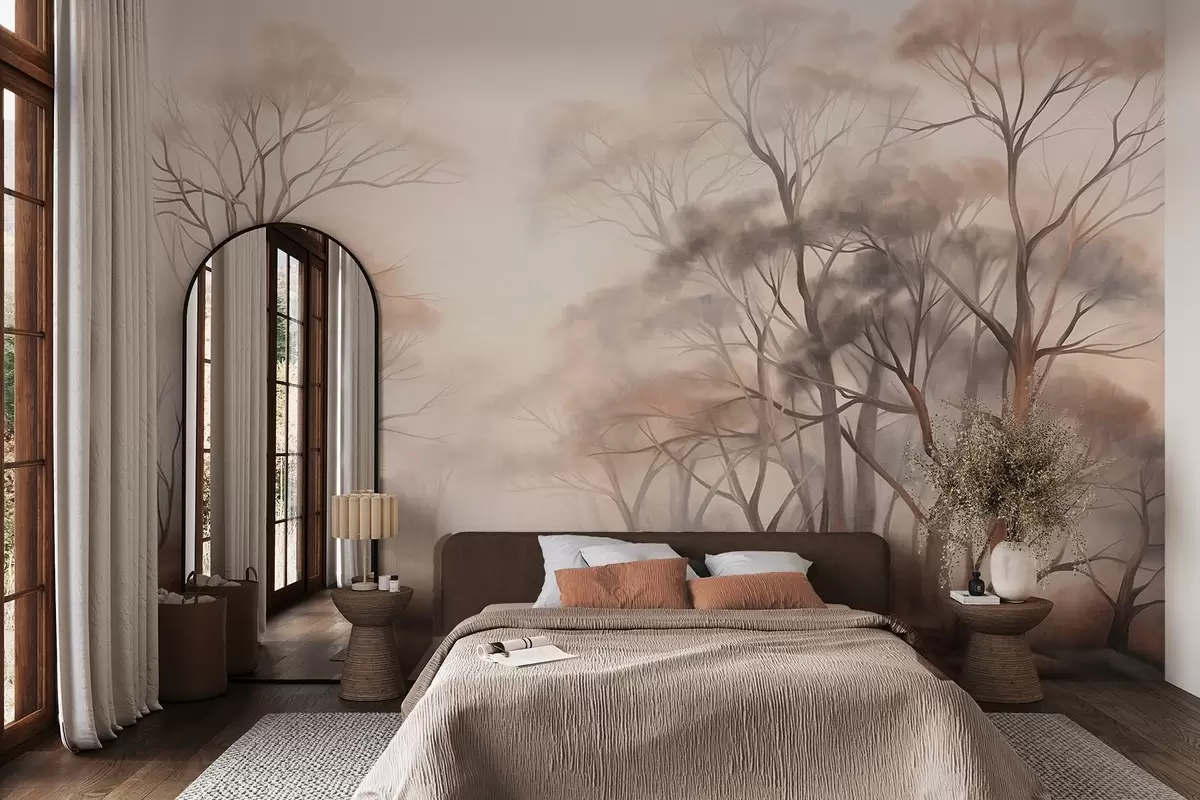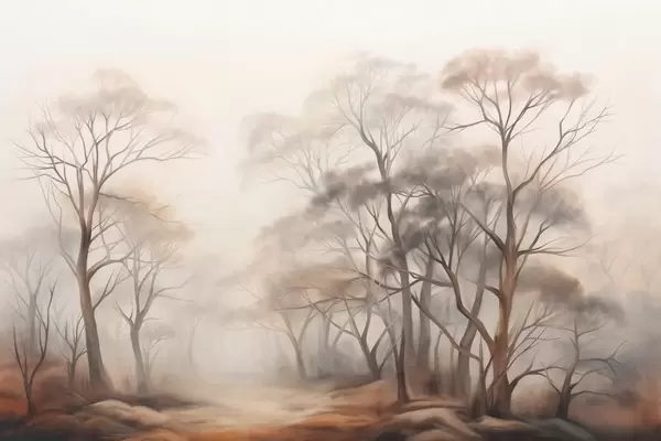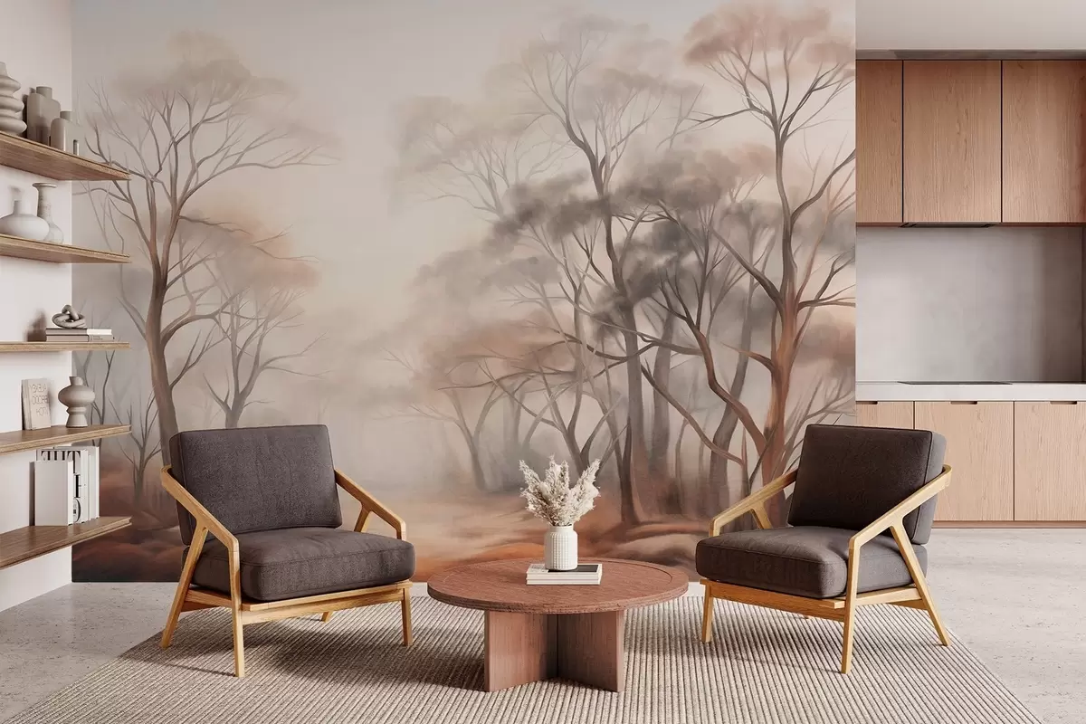 Тапете за зид Текстурирано дрвеће у магловитој шуми, магловити пејзаж са пригушеним бојама и нежним осветљењем бр. w09609
