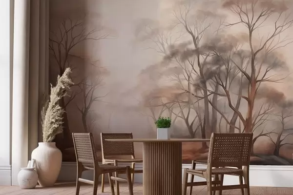 Тапете за зид Текстурирано дрвеће у магловитој шуми, магловити пејзаж са пригушеним бојама и нежним осветљењем бр. w09609