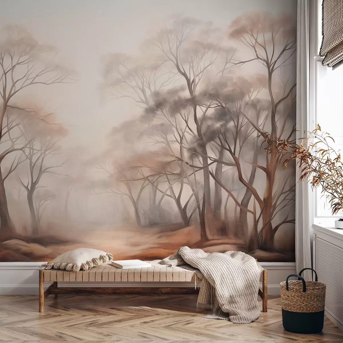 Тапете за зид Текстурирано дрвеће у магловитој шуми, магловити пејзаж са пригушеним бојама и нежним осветљењем бр. w09609