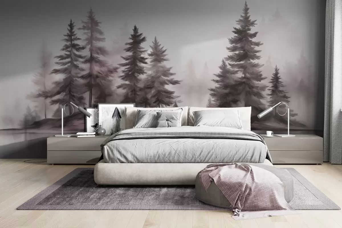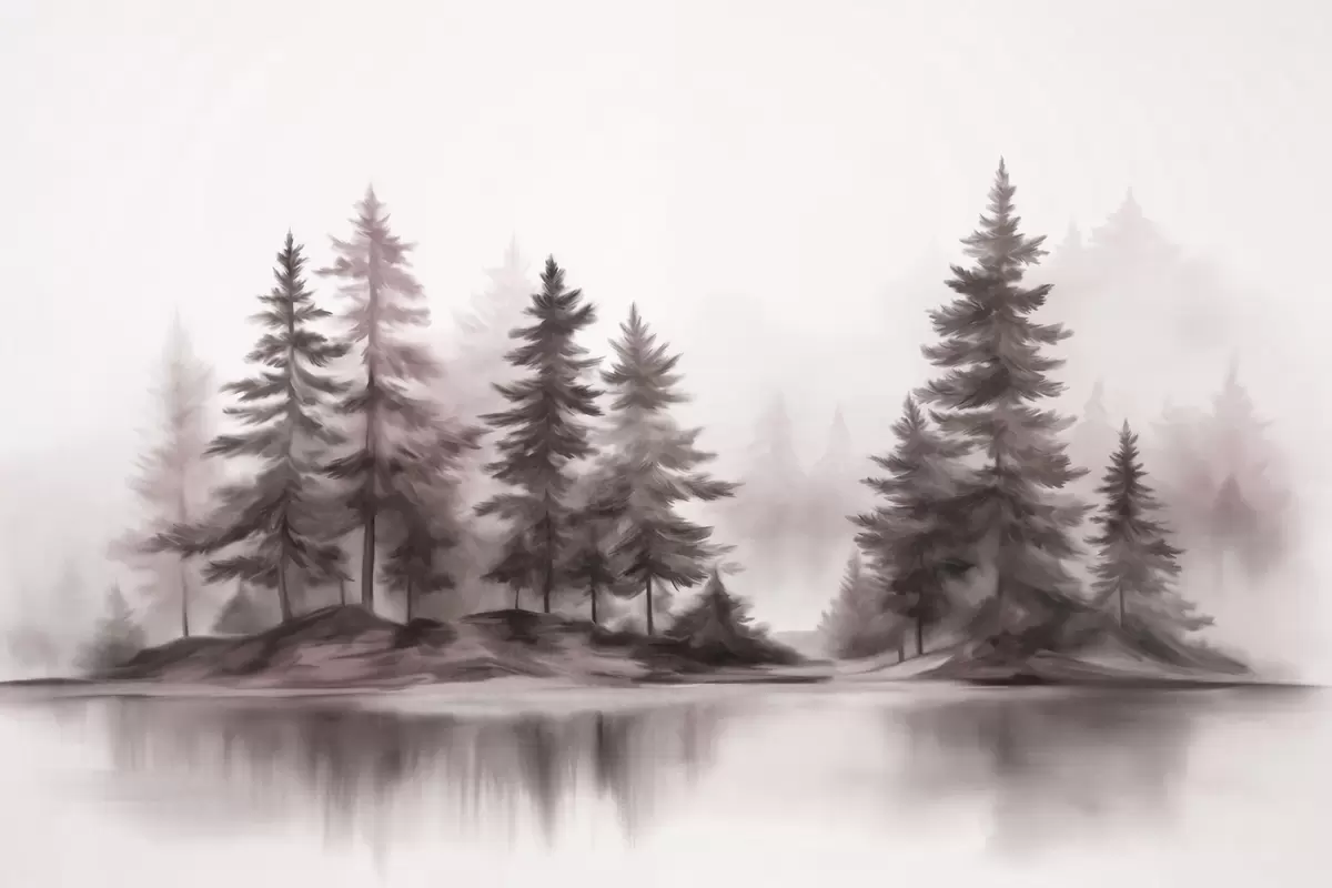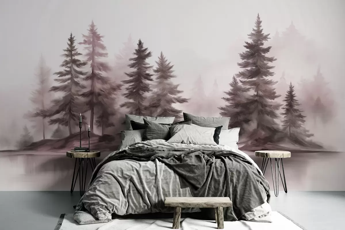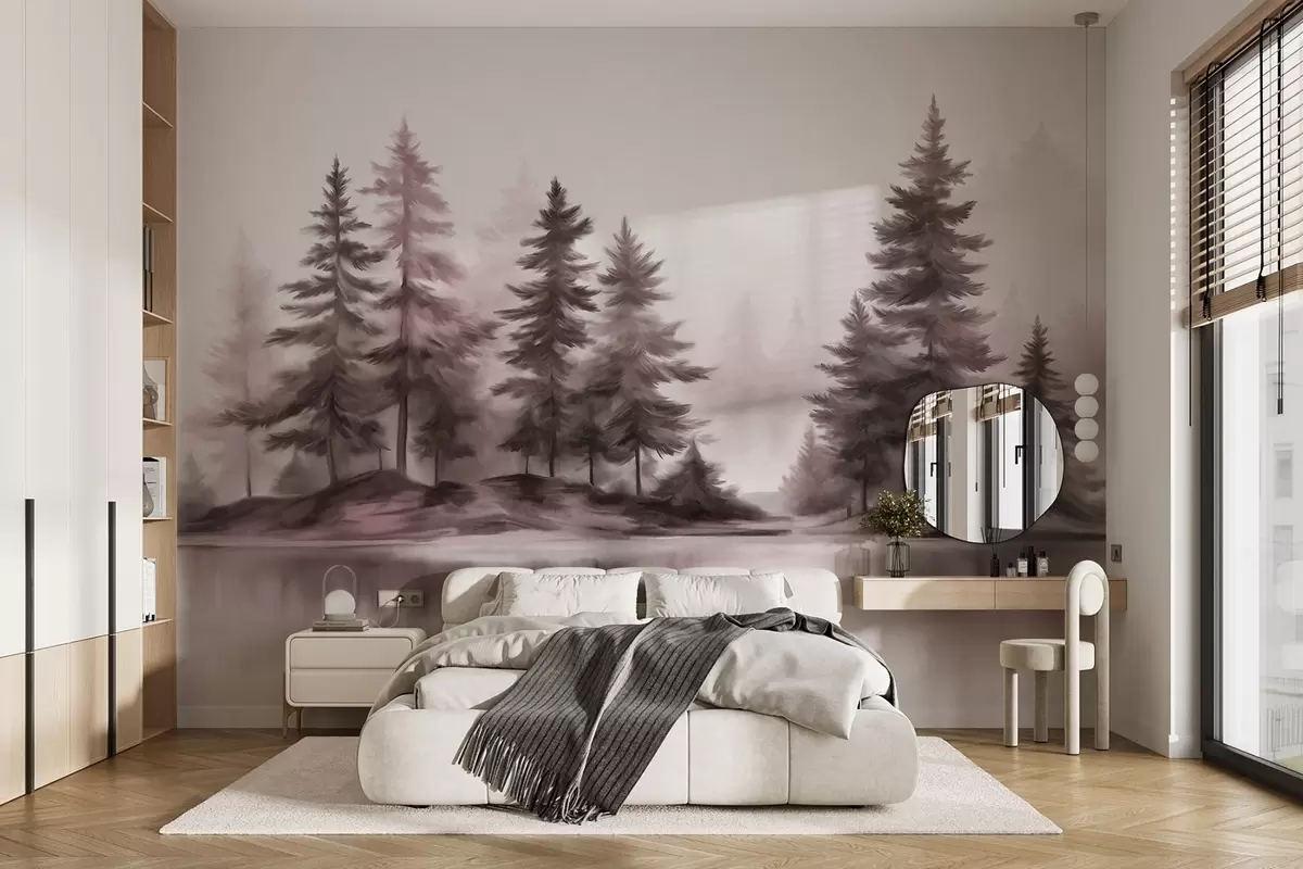 Тапете за зид Текстурирана магловита шума са високим боровима, имитација сликања бр. w09610v1