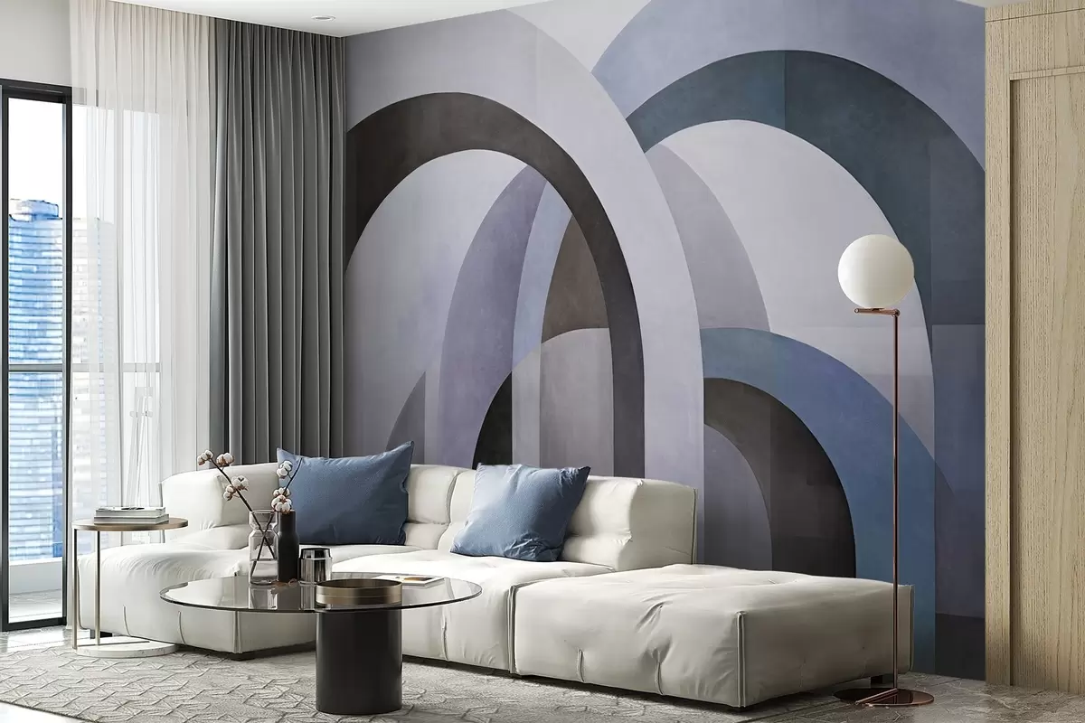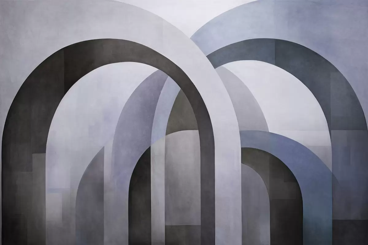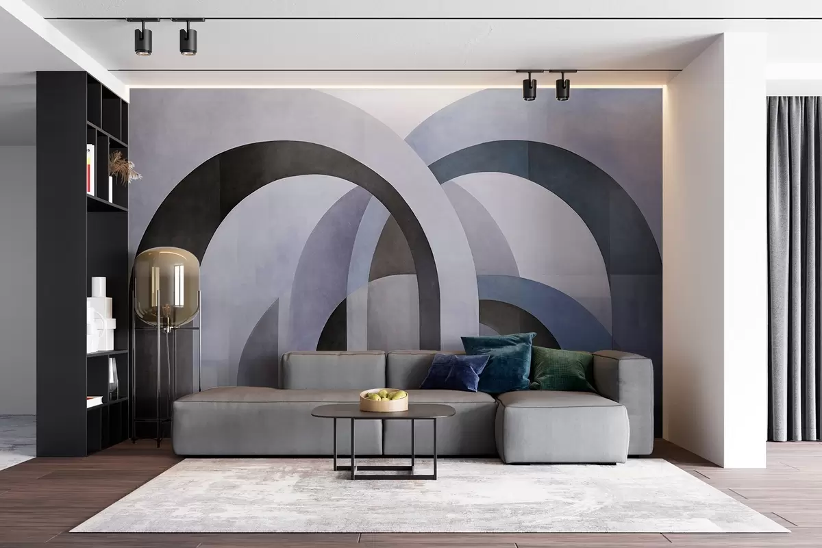 Тапете за зид Апстрактни текстурирани геометријски лукови у тоновима плаве, црне и сиве, слојевити модерни архитектонски дизајн бр. w09611v1