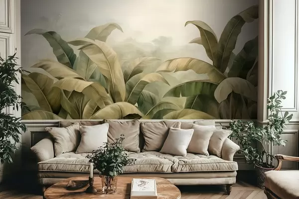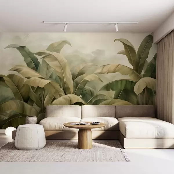 Тапете за зид Текстурирани густи џунгларски пејзаж са великим листовима банане у пригушеним зеленим и беж тоновима бр. w09613