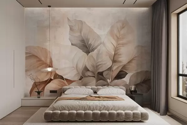 Тапете за зид Текстурирана имитација сликања великих, светло смеђих листова на неутралној позадини са суптилним потезима четкице бр. w09614