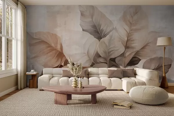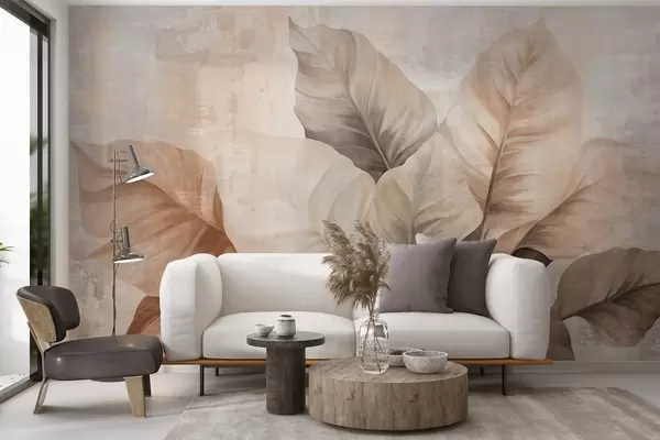 Тапете за зид Текстурирана имитација сликања великих, светло смеђих листова на неутралној позадини са суптилним потезима четкице бр. w09614