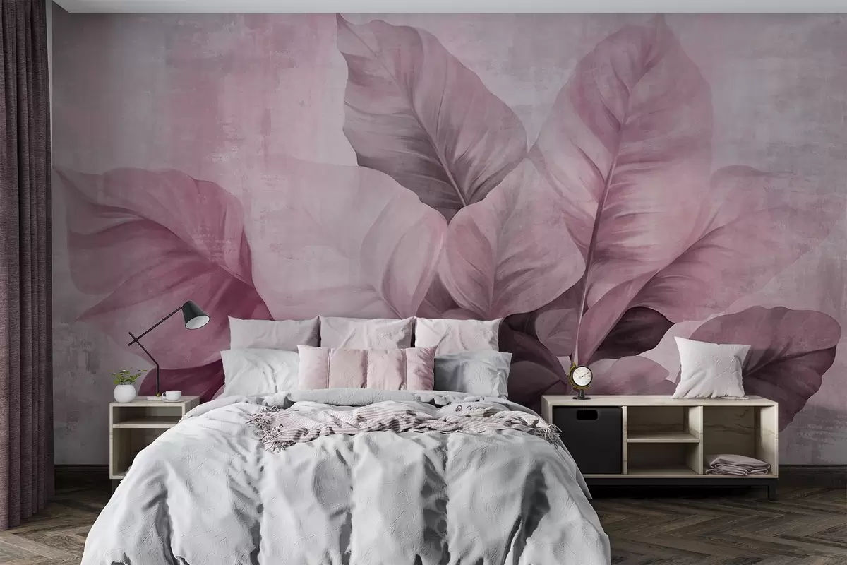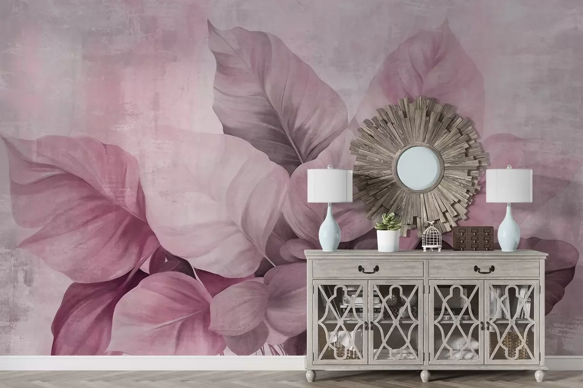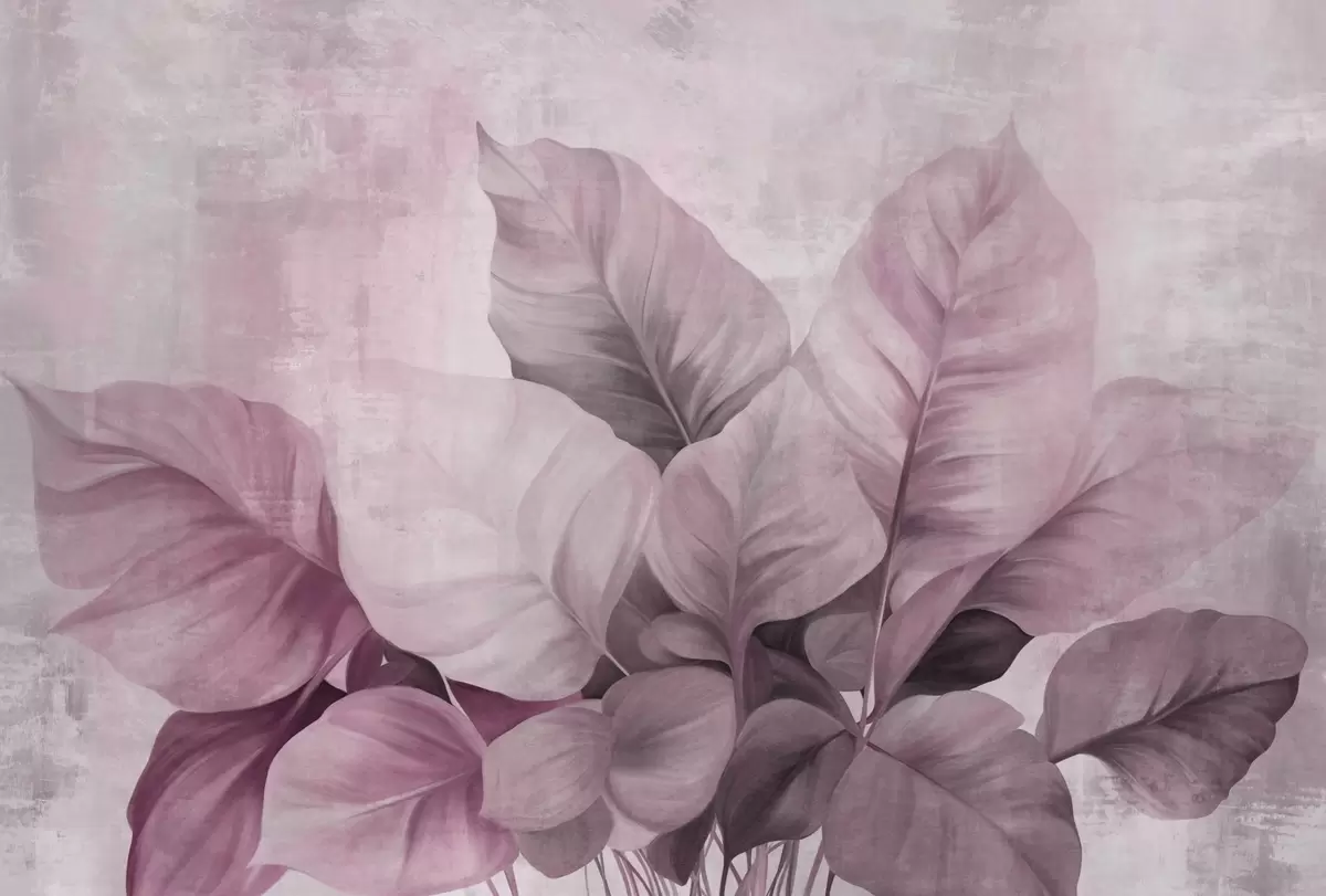 Тапете за зид Текстурирана имитација сликања великих, светло ружичастих листова на неутралној позадини са суптилним потезима четкице бр. w09614v1
