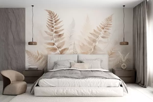 Тапете за зид Текстурирани сушени листови папрати у различитим нијансама смеђе, са меком, светлом позадином у стилу акварела бр. w09615