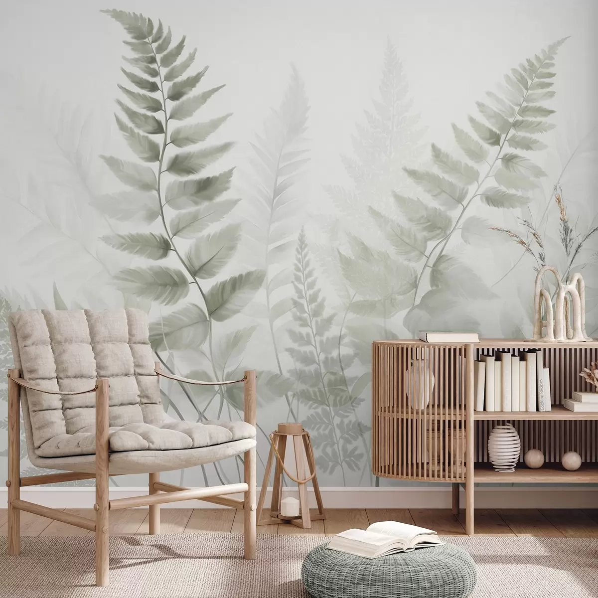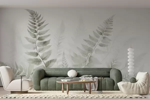 Тапете за зид Текстурирани сушени листови папрати у различитим нијансама зелене, са меком, светлом позадином у стилу акварела бр. w09615v1