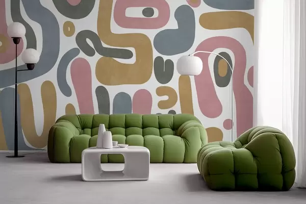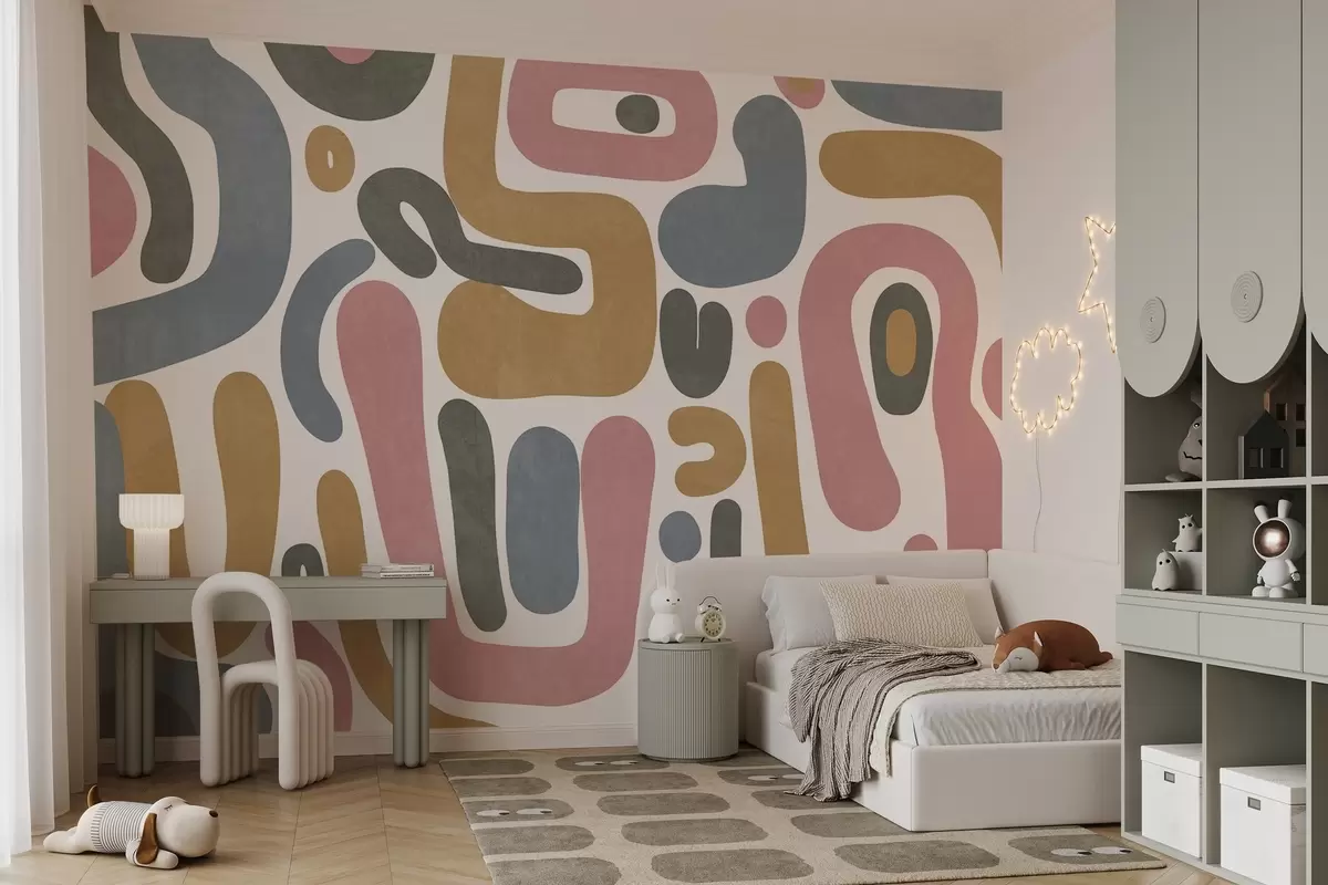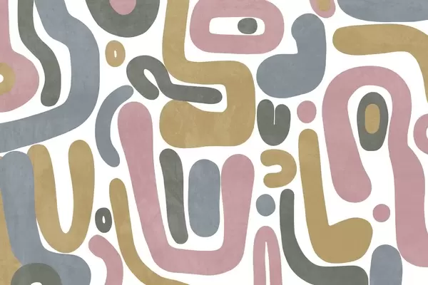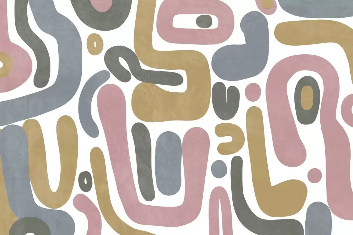 Тапете за зид Апстрактни текстурирани облици у пастелно ружичастој, пригушеној плавој, сенф жутој и сивој боји на белој позадини, модерна уметност бр. w09620