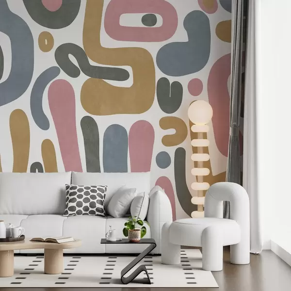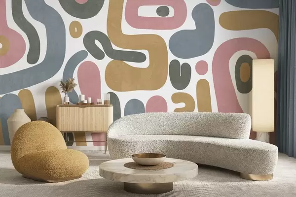 Тапете за зид Апстрактни текстурирани облици у пастелно ружичастој, пригушеној плавој, сенф жутој и сивој боји на белој позадини, модерна уметност бр. w09620