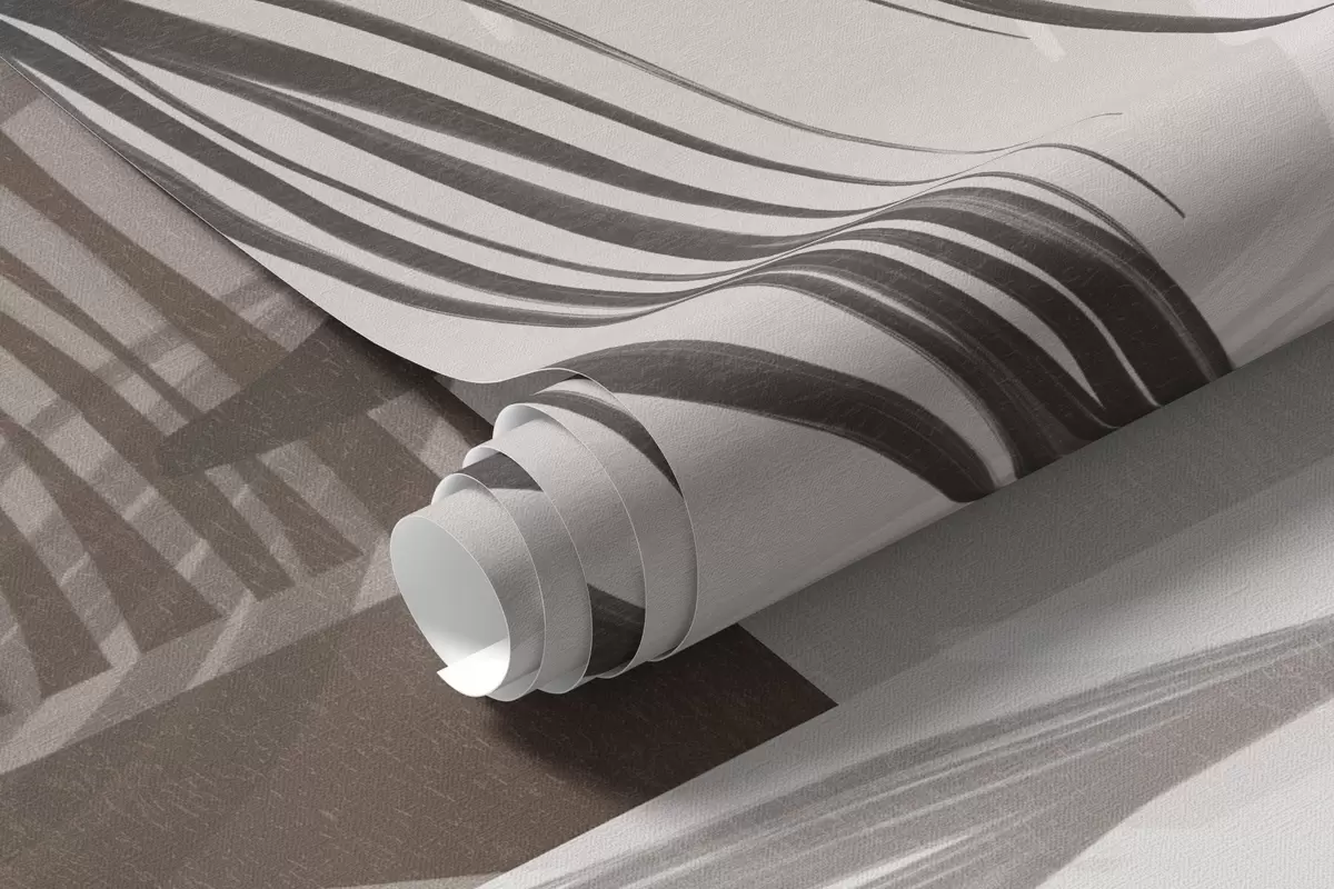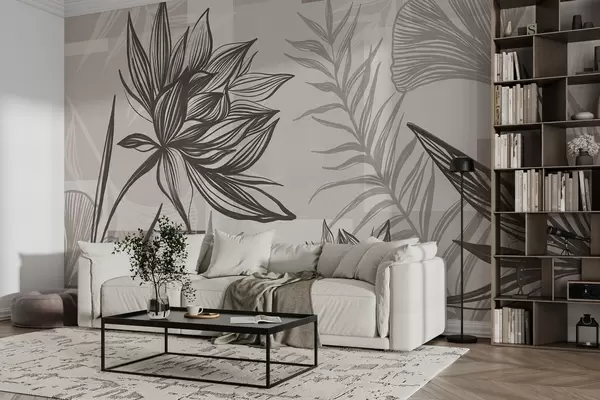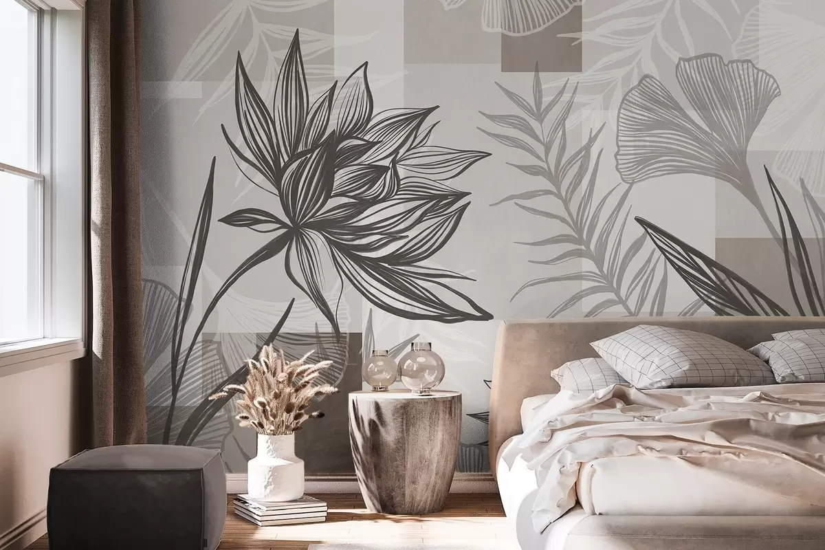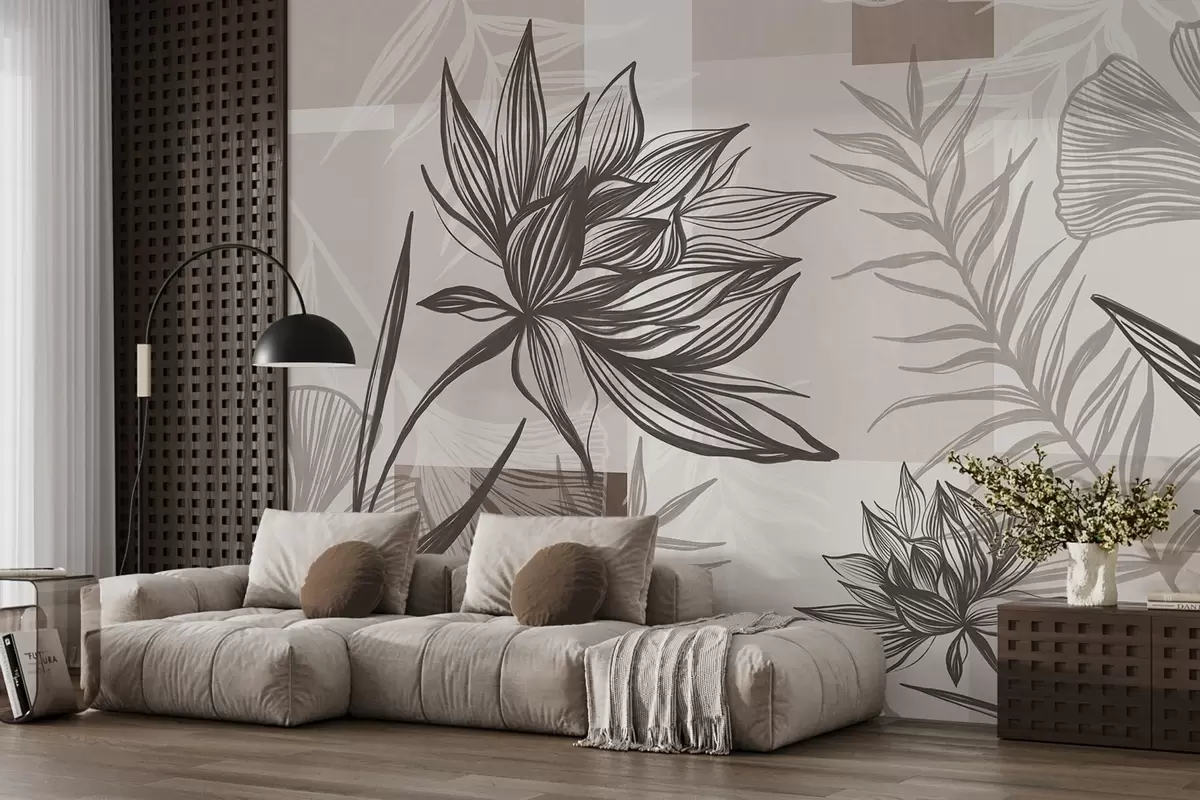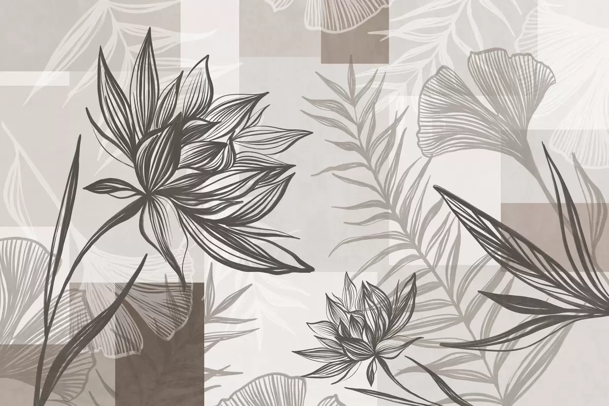 Тапете за зид Текстурирано стилизовано цвеће и лишће у нијансама браон и беж боје, са геометријском позадином, линијском уметношћу бр. w09629