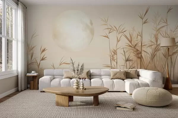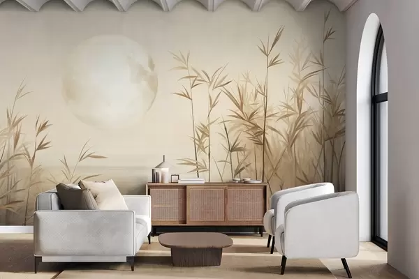 Тапете за зид Текстурирани пејзаж са високом трском, језером и бледим месецом на магловитом небу бр. w09631