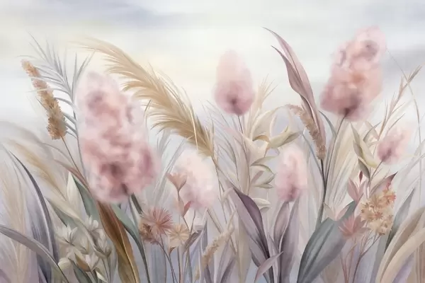 Тапете за зид Ружичаста и беж пампас трава и друго суво цвеће са меким, магловитим небом у позадини бр. w09635