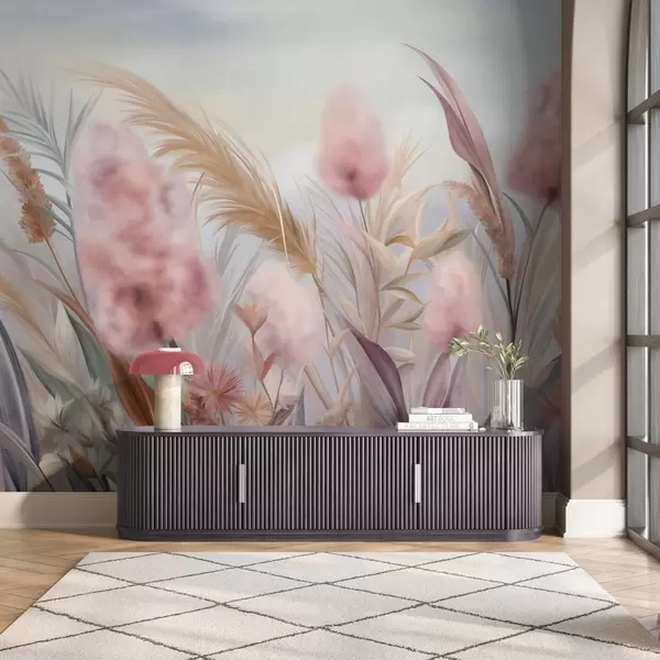 Тапете за зид Ружичаста и беж пампас трава и друго суво цвеће са меким, магловитим небом у позадини бр. w09635