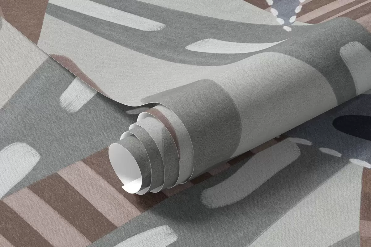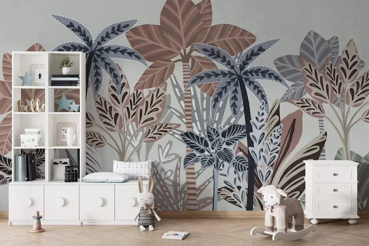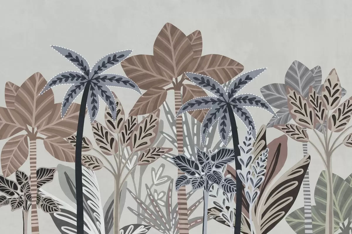 Тапете за зид Текстуриране тропске биљке и палме са пригушеним бојама у декоративном бохо стилу на сивој позадини бр. w09639v1