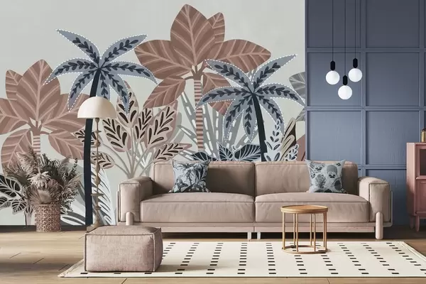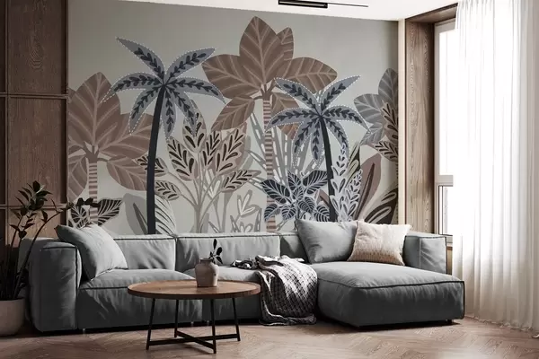 Тапете за зид Текстуриране тропске биљке и палме са пригушеним бојама у декоративном бохо стилу на сивој позадини бр. w09639v1