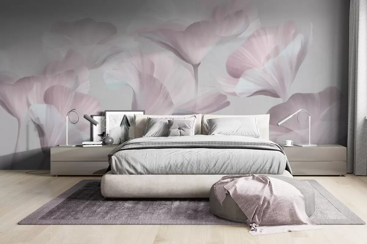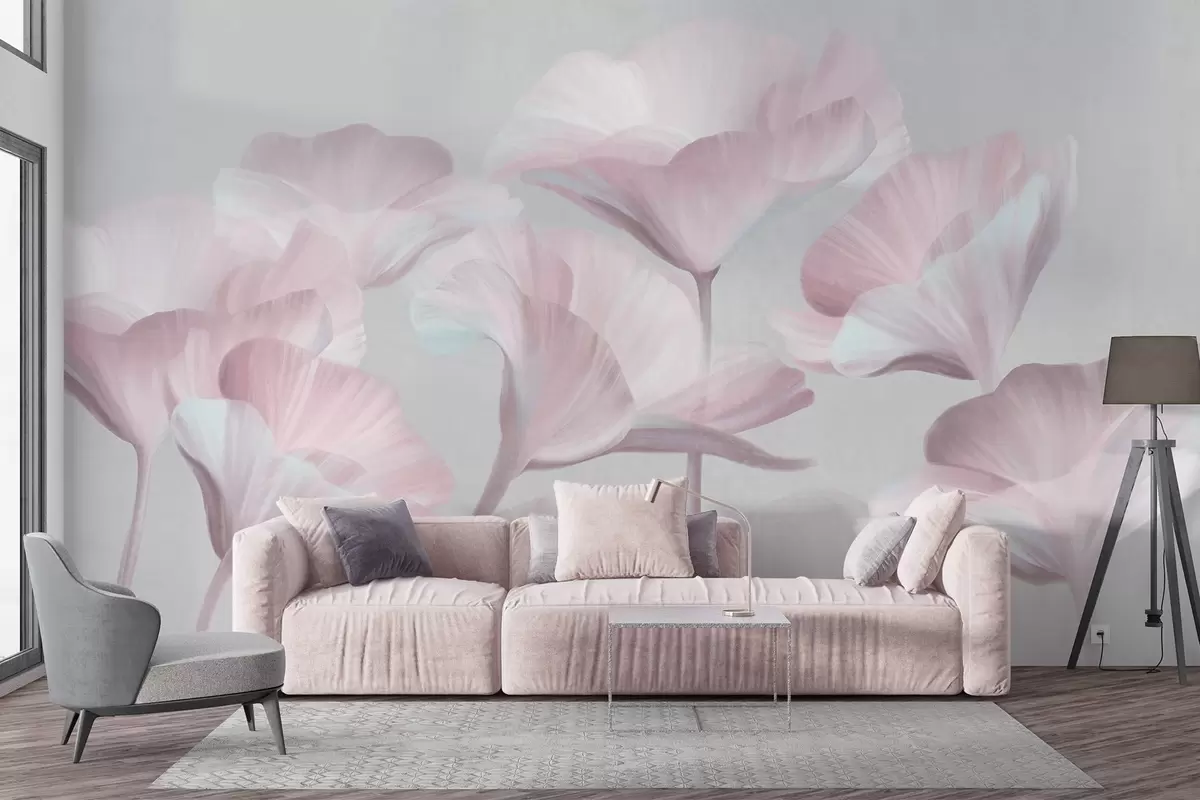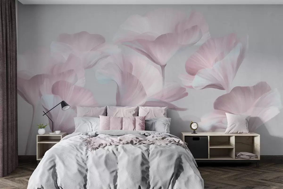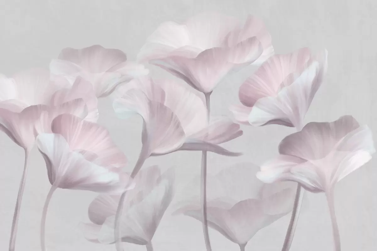 Тапете за зид Бледо ружичасти текстурирани провидни цветови лотоса са нежним латицама на пригушеној сивој позадини бр. w09640v1