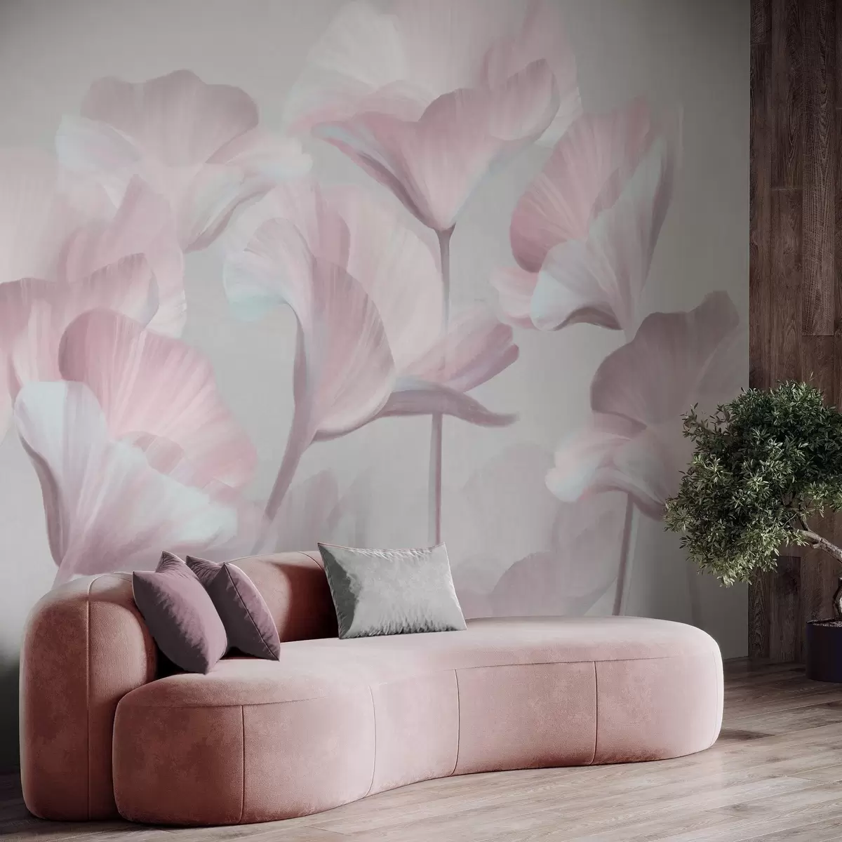 Тапете за зид Бледо ружичасти текстурирани провидни цветови лотоса са нежним латицама на пригушеној сивој позадини бр. w09640v1