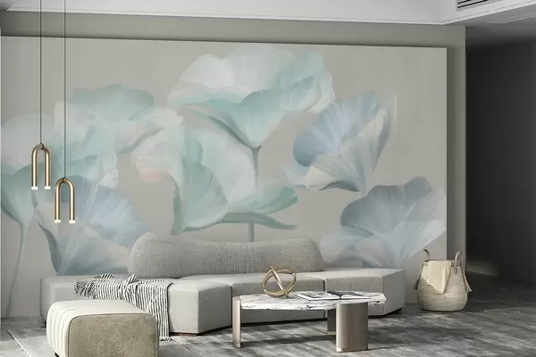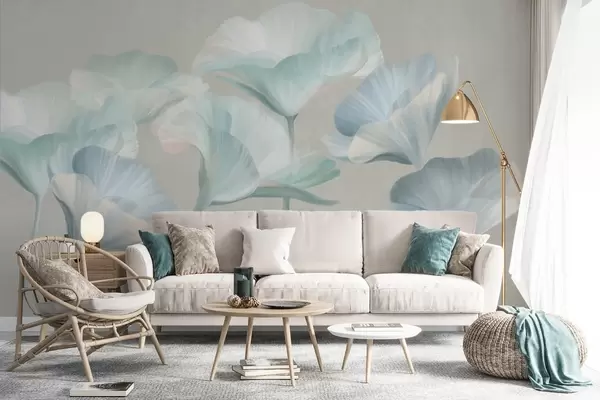 Тапете за зид Бледо тиркизно текстурирани провидни цветови лотоса са нежним латицама на пригушеној сивој позадини бр. w09640v2