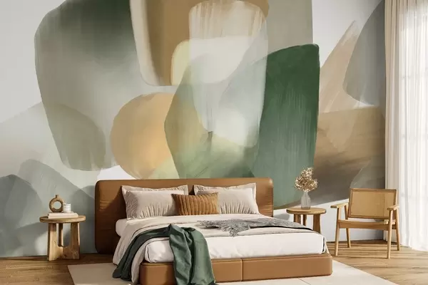 Тапете за зид Апстрактни текстурирани облици у пригушеним зеленим и беж бојама, са меким ивицама и преклапајућим слојевима бр. w09642
