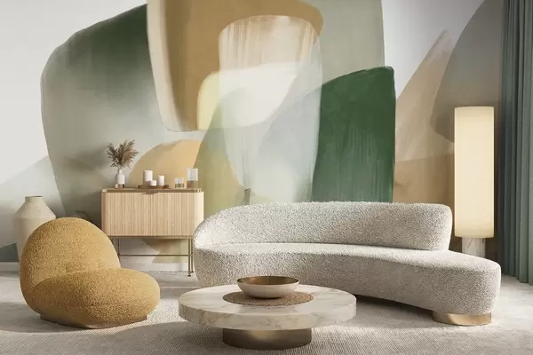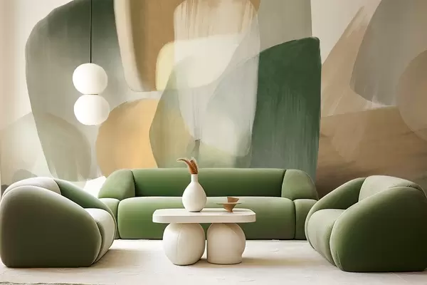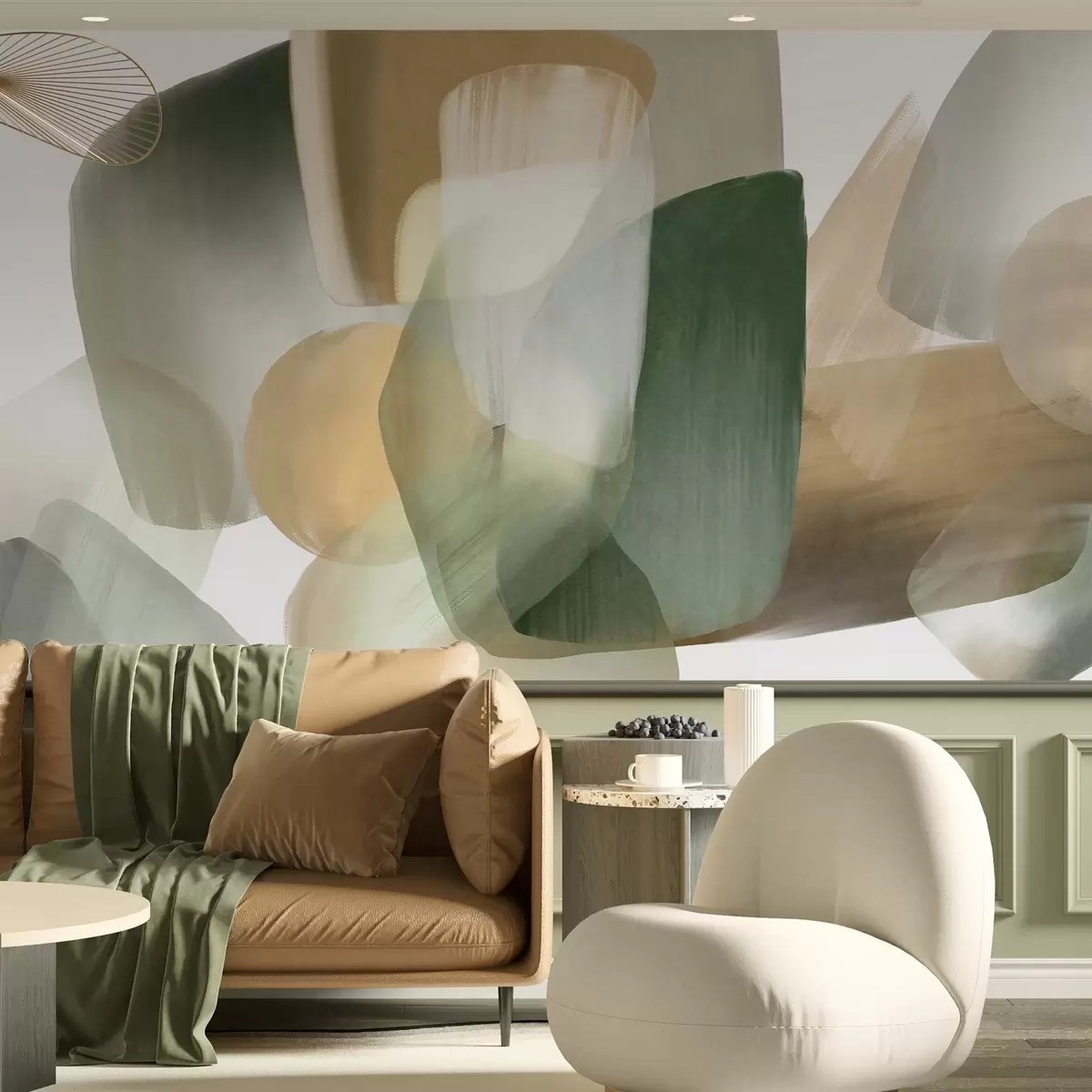 Тапете за зид Апстрактни текстурирани облици у пригушеним зеленим и беж бојама, са меким ивицама и преклапајућим слојевима бр. w09642