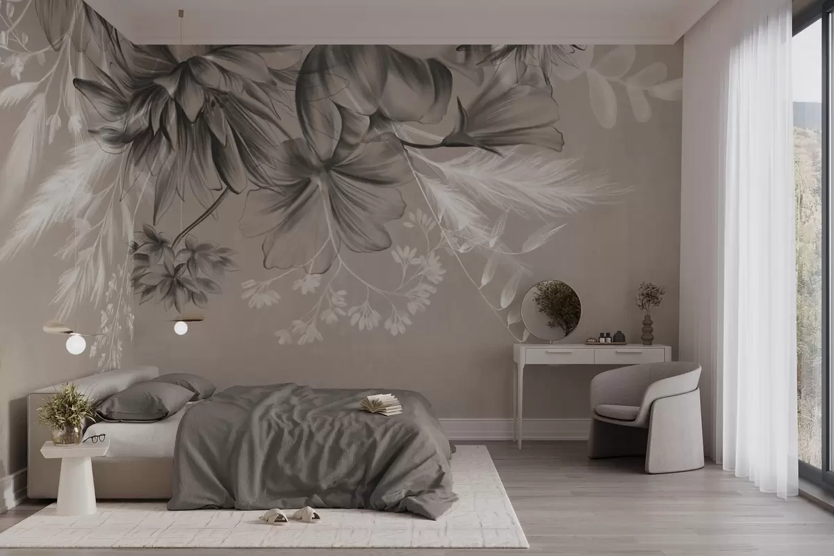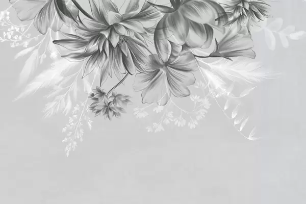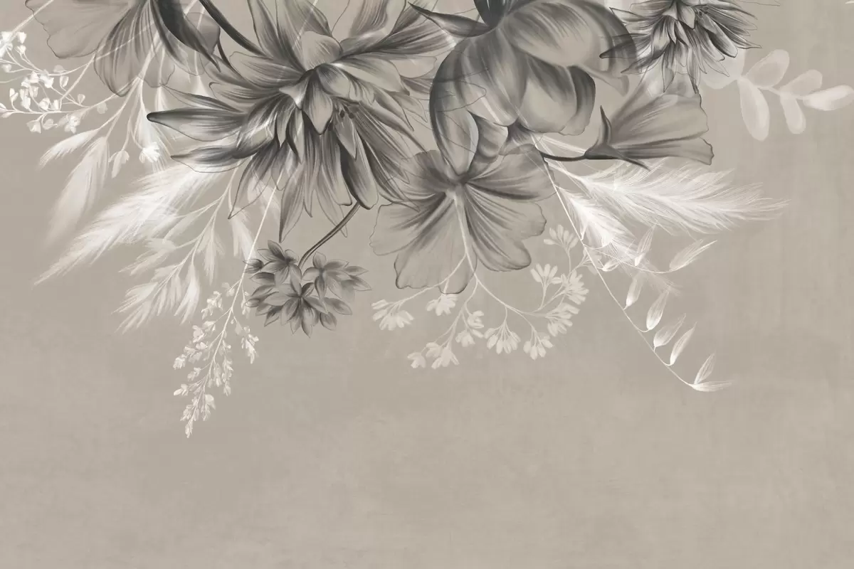 Тапете за зид Текстурирано цвеће и папрати у нијансама тамно сиве и беле на пригушеној беж позадини у стилу цртања бр. w09644