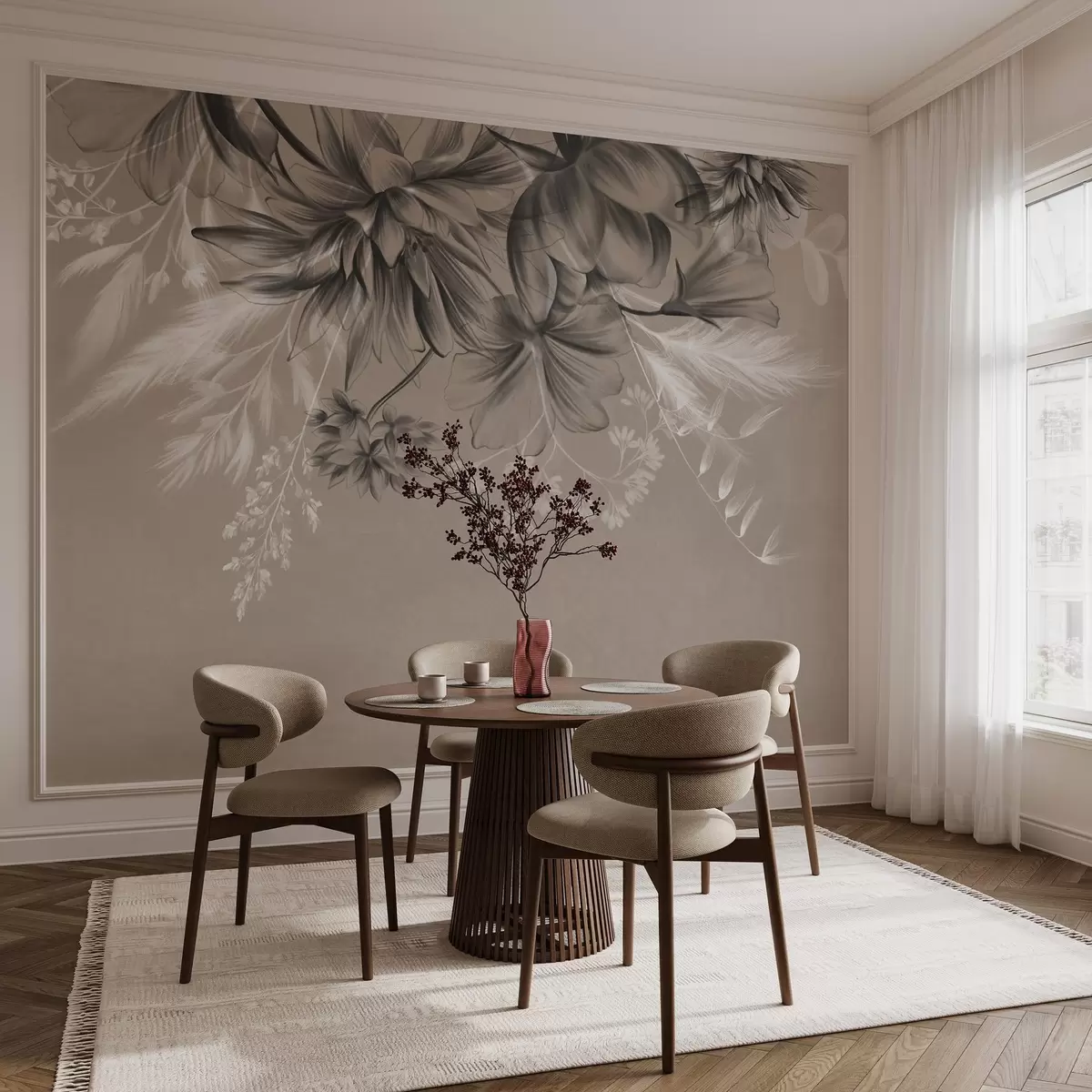 Тапете за зид Текстурирано цвеће и папрати у нијансама тамно сиве и беле на пригушеној беж позадини у стилу цртања бр. w09644