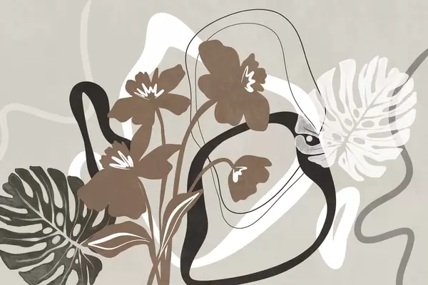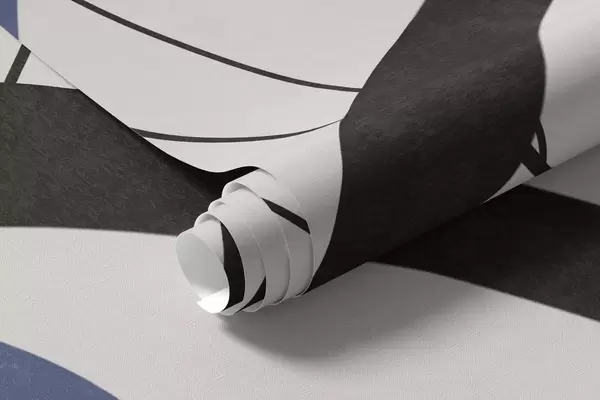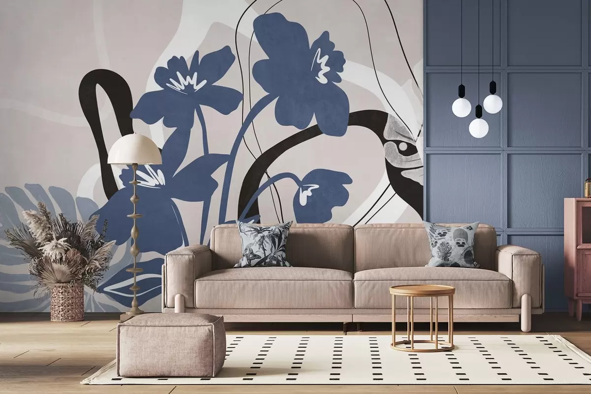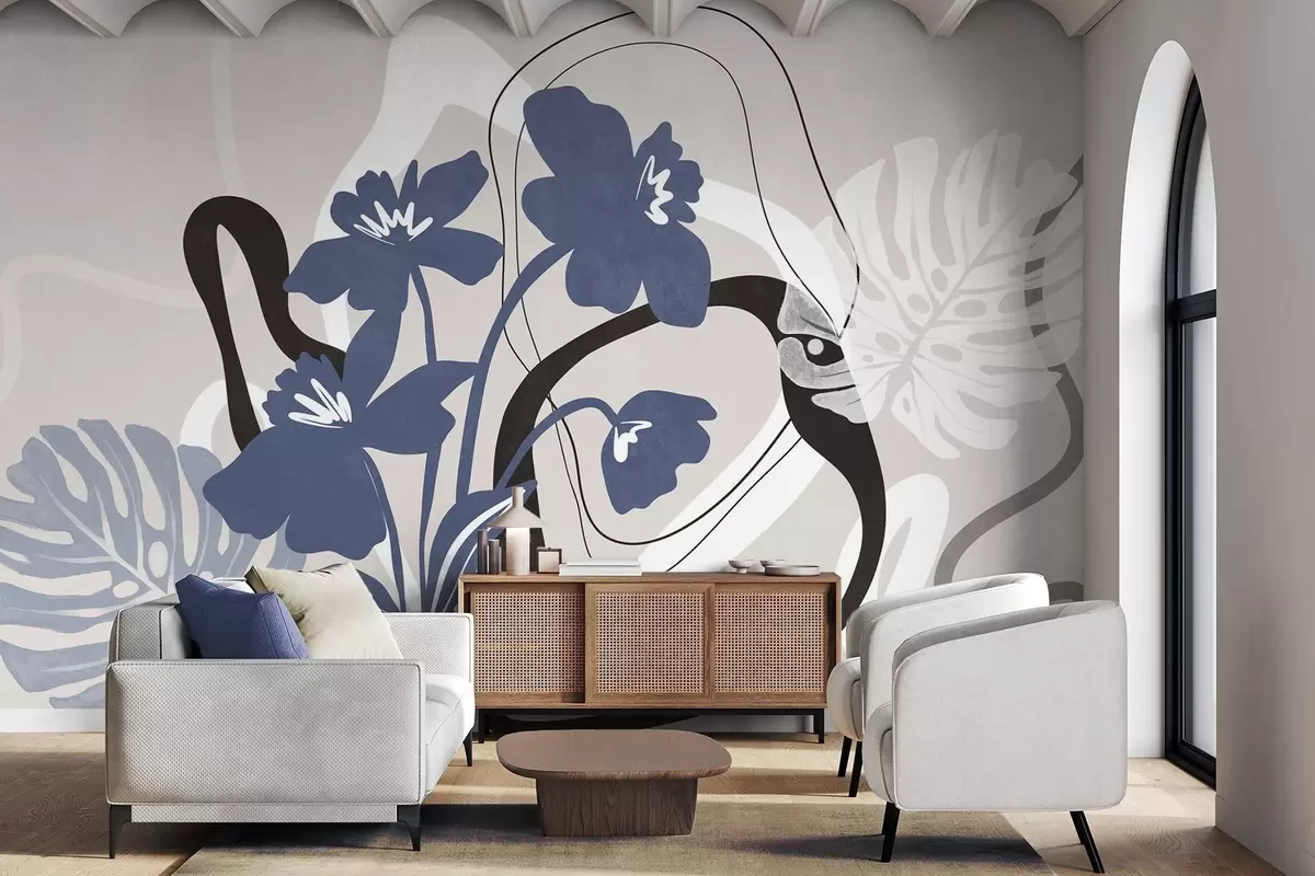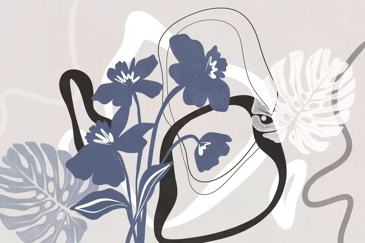 Тапете за зид Апстрактно текстурирано плаво цвеће са белим и црним облицима на светло беж позадини, минималистичка уметност бр. w09645