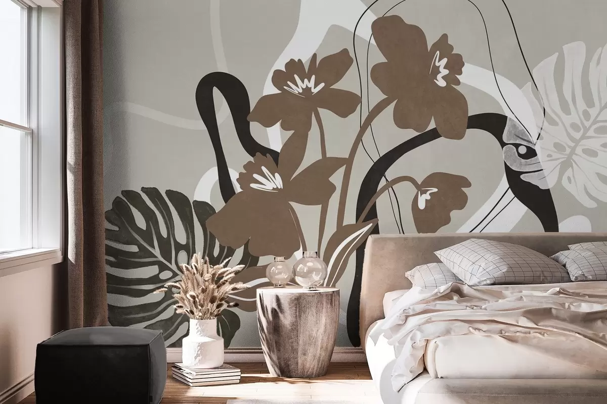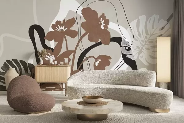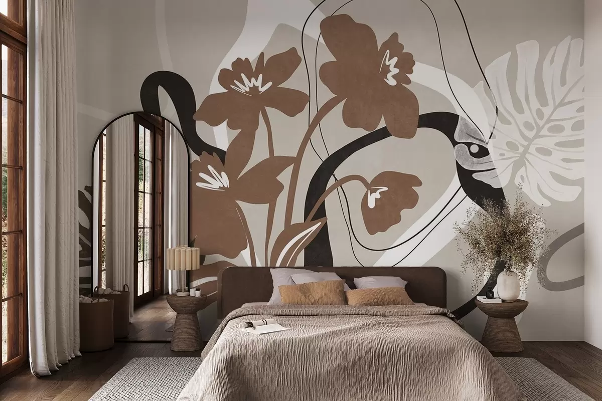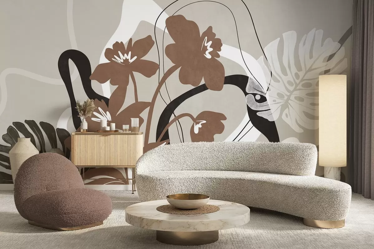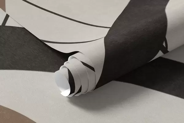 Тапете за зид Апстрактно текстурирано смеђе цвеће са белим и црним облицима на беж позадини, минималистичка уметност бр. w09645v1