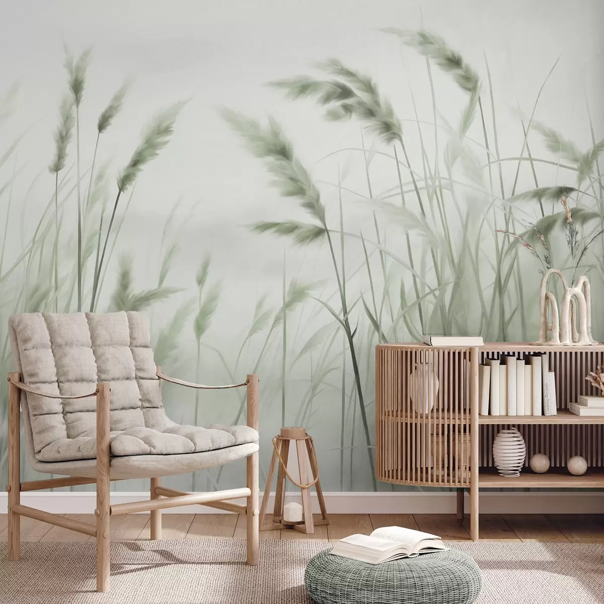 Тапете за зид Висока, текстурирана сува трава са класјевима пшенице на пољу на мекој, бледој позадини бр. w09648v1
