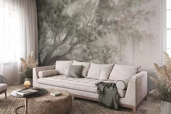Тапете за зид Текстурирано дрво са светлозеленим листовима и гранама, са меком, магловитом позадином бр. w09650