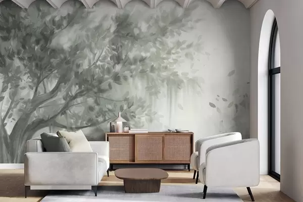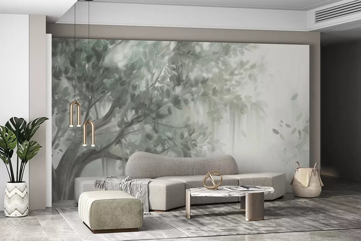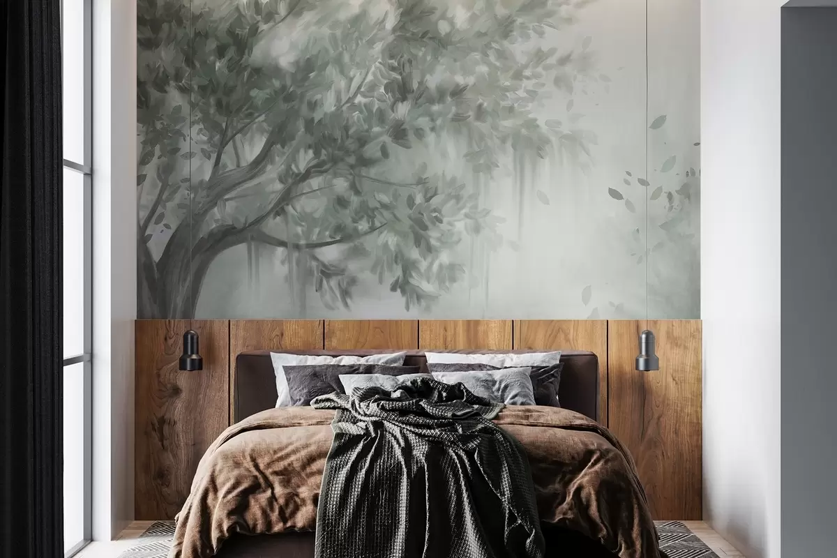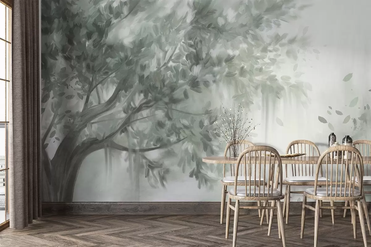Тапете за зид Текстурирано дрво са зеленим лишћем и гранама, са меком, магловитом позадином бр. w09650v1