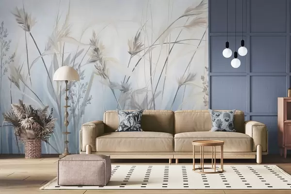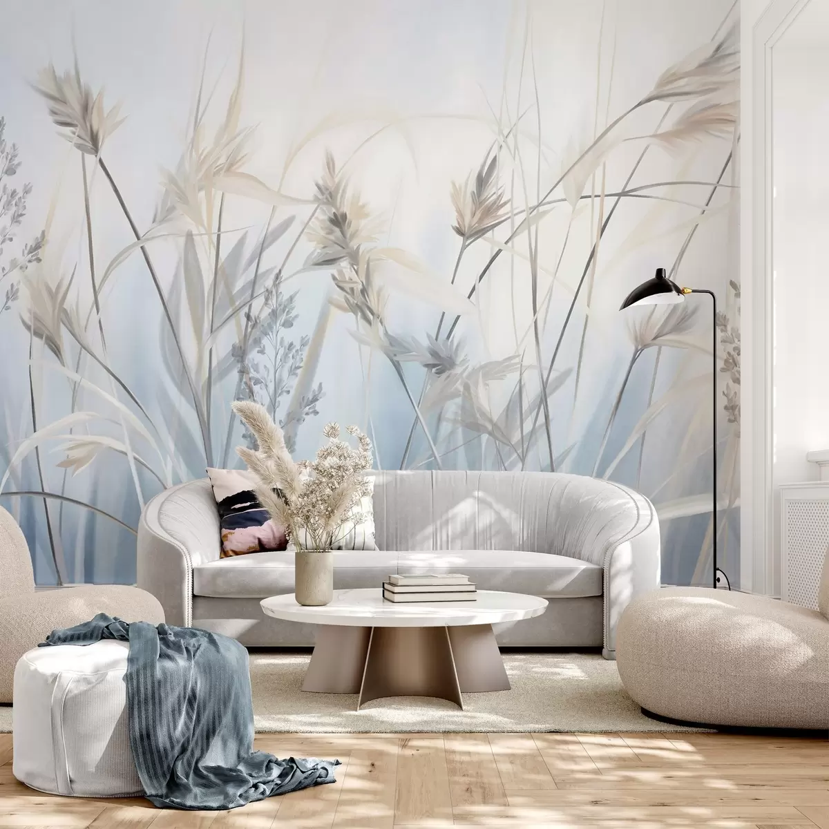 Тапете за зид Високе, суве стабљике траве са пернатим врховима у пригушеним тоновима, мека, магловито плава и бела позадина бр. w09652