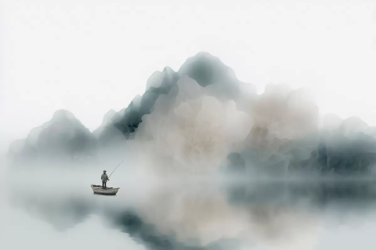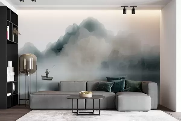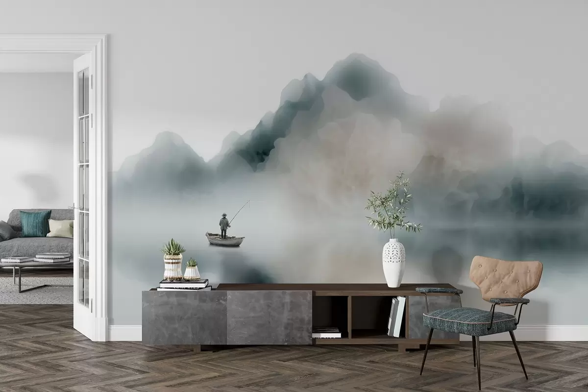 Тапете за зид Планински пејзаж са чамцем и рибаром који се растварају у мекој магли бр. w09678
