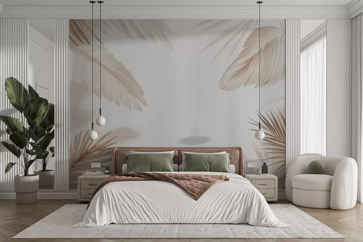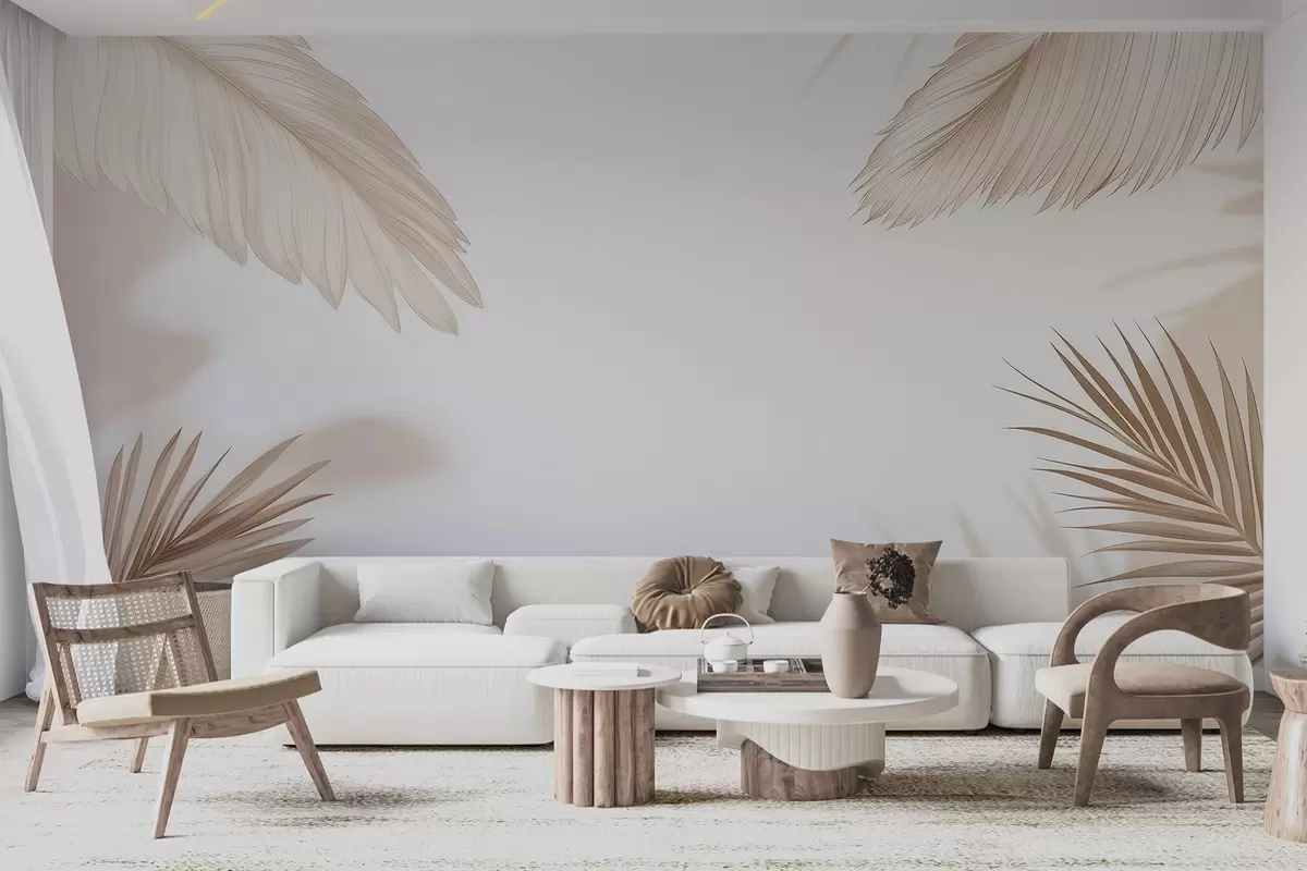 Тапете за зид Беж тропски декор са силуетама палминог лишћа и меким сенкама бр. w09714
