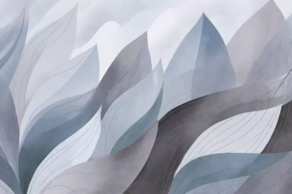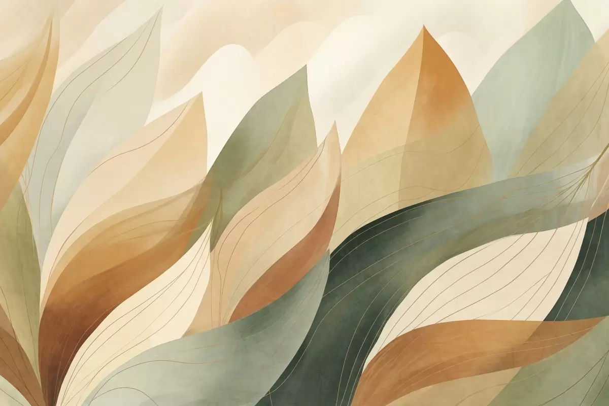 Тапете за зид Апстрактно лишће, пригушени земљани тонови зелене, наранџасте са нежним линијским детаљима, мека текстура акварела бр. w09736