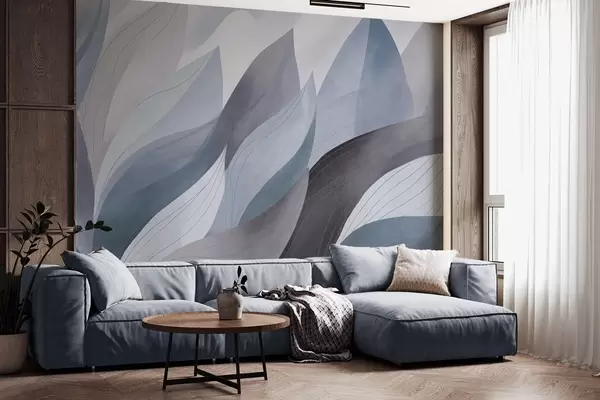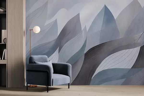 Тапете за зид Апстрактно лишће, пригушени земљани тонови плаве са нежним детаљима линија, мека текстура акварела бр. w09736v1