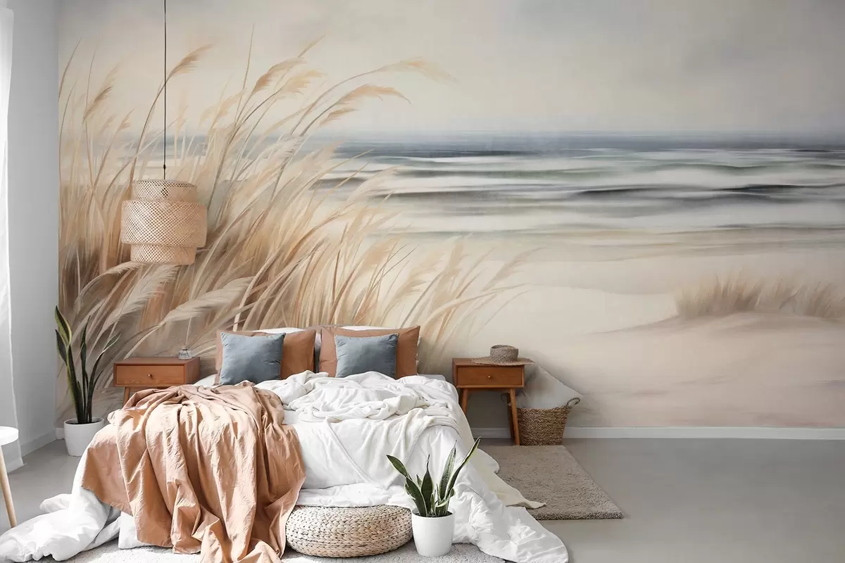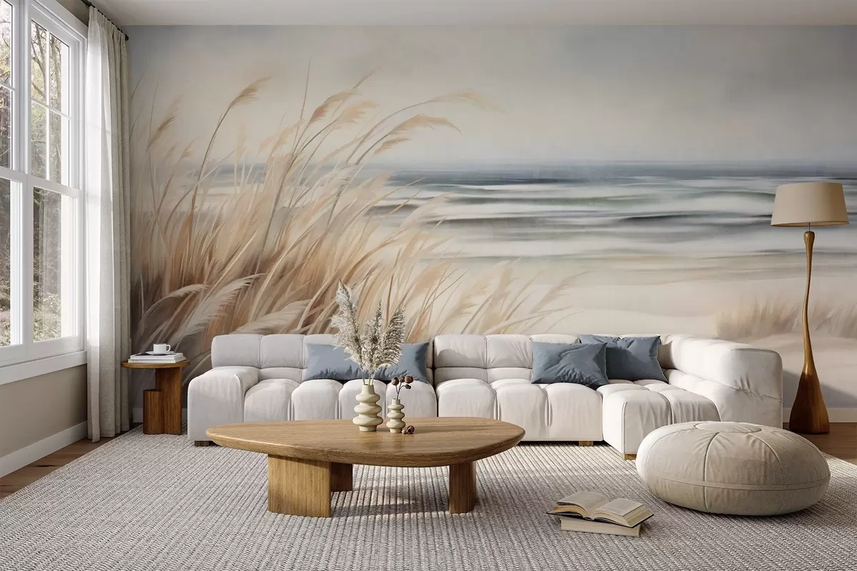 Тапете за зид Текстурирани пејзаж са сувом травом на пешчаној плажи, са океаном и небом у позадини бр. w09739