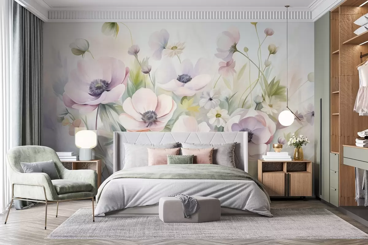 Тапете за зид Поље пастелно ружичастих и белих цветова анемона, зеленог лишћа и малих белих тратинчица бр. w09742