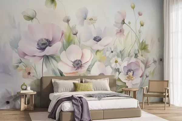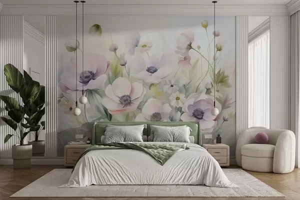 Тапете за зид Поље пастелно ружичастих и белих цветова анемона, зеленог лишћа и малих белих тратинчица бр. w09742