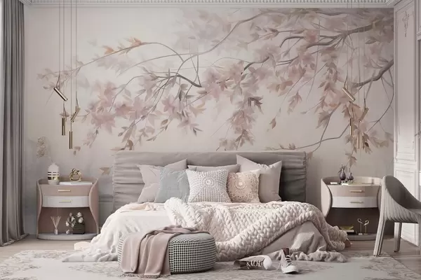 Тапете за зид Текстурирани пејзаж са граном цвета трешње, ружичастим листовима, меком, магловитом позадином бр. w09743