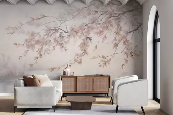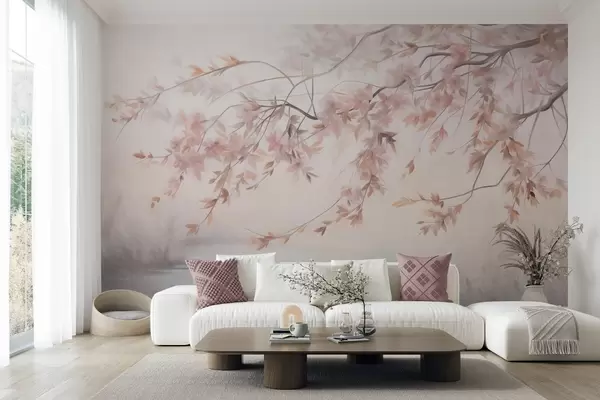 Тапете за зид Текстурирани пејзаж са граном цвета трешње, ружичастим листовима, меком, магловитом позадином бр. w09743